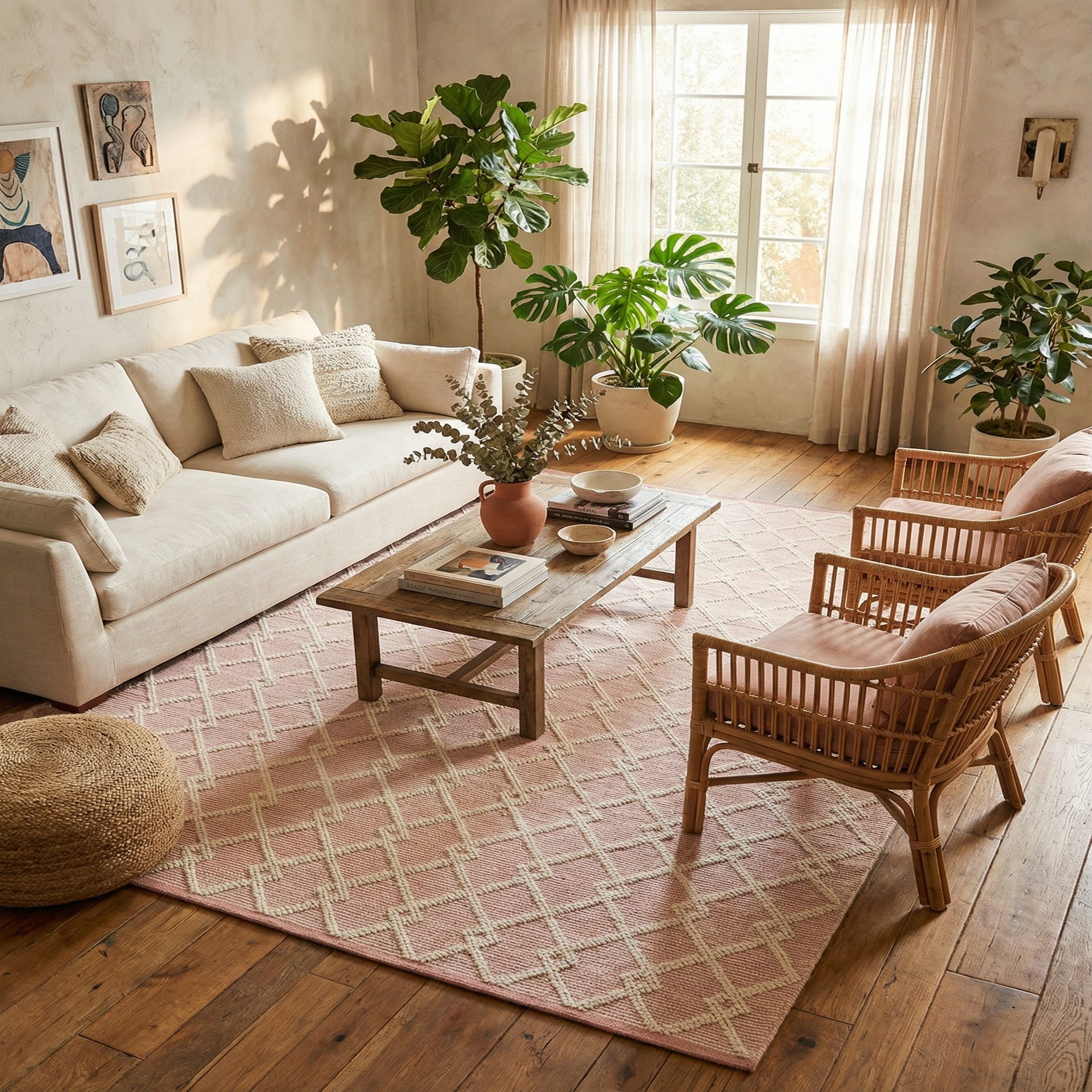 Primary color is English Rose. Colors in this rug include: English Rose, Ivory.