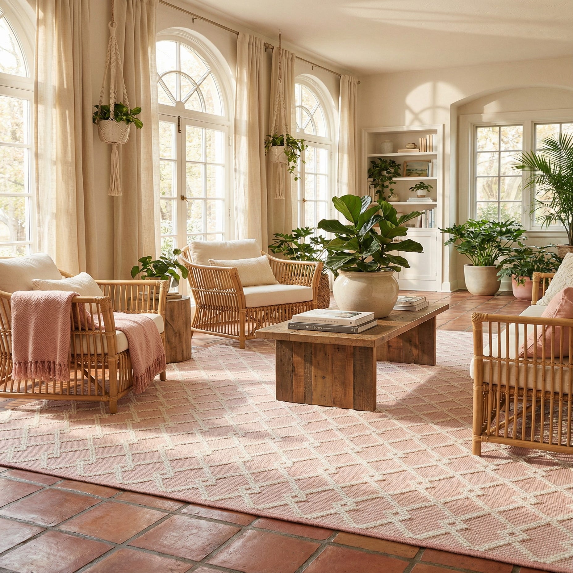 Primary color is English Rose. Colors in this rug include: English Rose, Ivory.