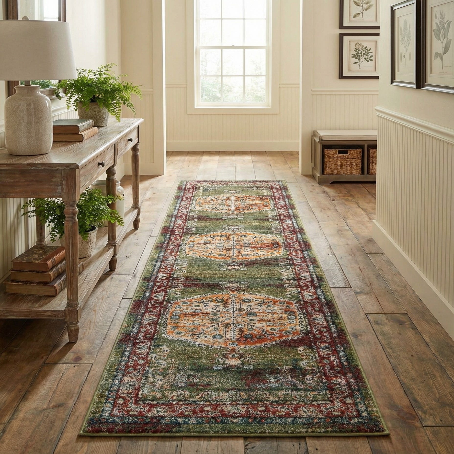 Primary color is Fern Green. Colors in this rug include: Fern Green, Beige, Black, Blue, Brown, Hunter Green, Ivory, Light Blue, Navy Blue, Orange, Peach, Plum Red, Purple, Red.