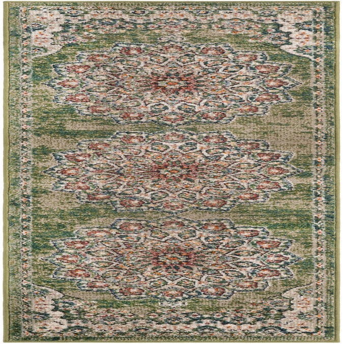 Primary color is Fern Green. Colors in this rug include: Fern Green, Beige, Black, Blue, Brown, Ivory, Light Blue, Light Green, Navy Blue, Orange, Peach, Plum Red, Red.