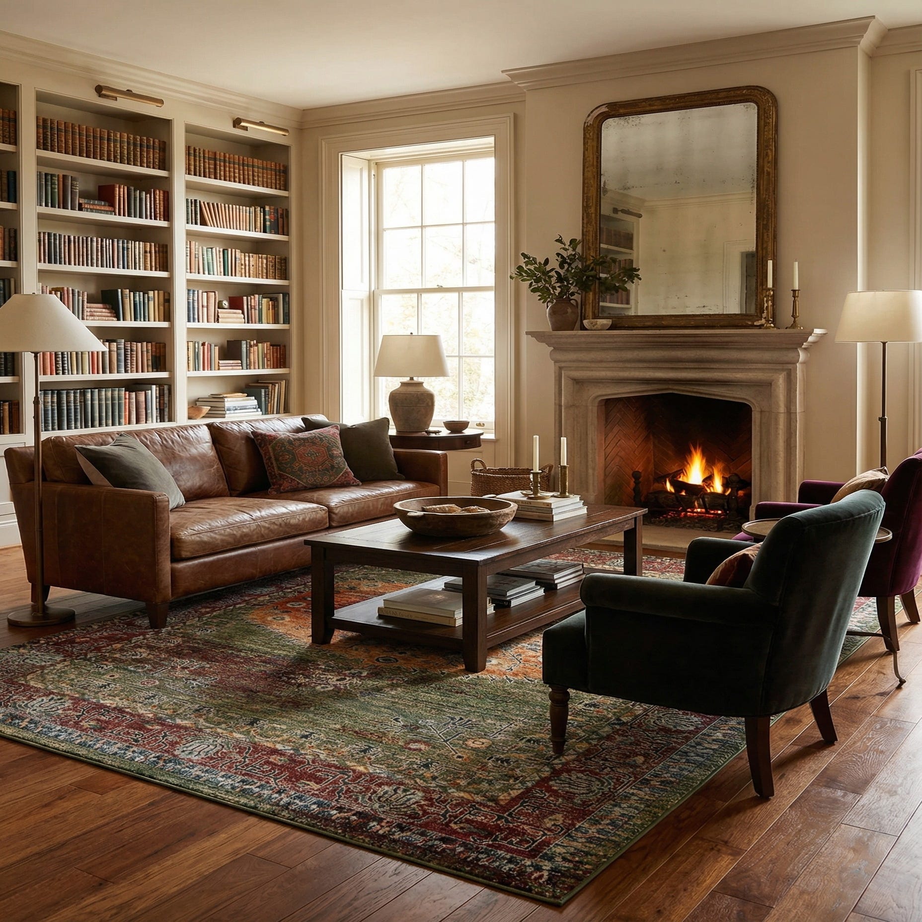 Primary color is Fern Green. Colors in this rug include: Fern Green, Beige, Blue, Green, Hunter Green, Ivory, Light Blue, Navy Blue, Orange, Peach, Plum Red, Red, Purple.