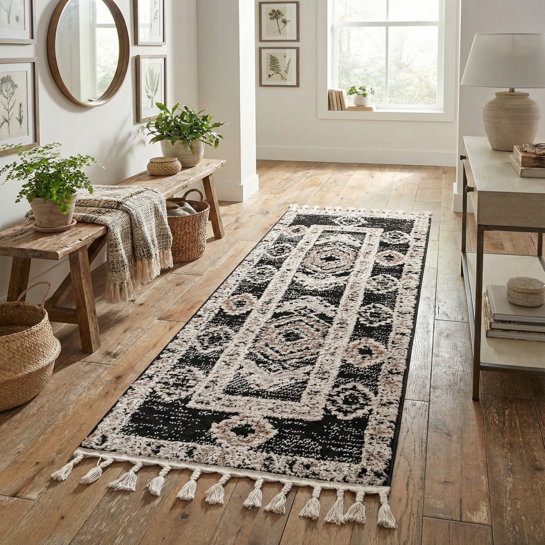 Primary color is Fossil Gray. Colors in this rug include: Fossil Gray, Black, Ivory.