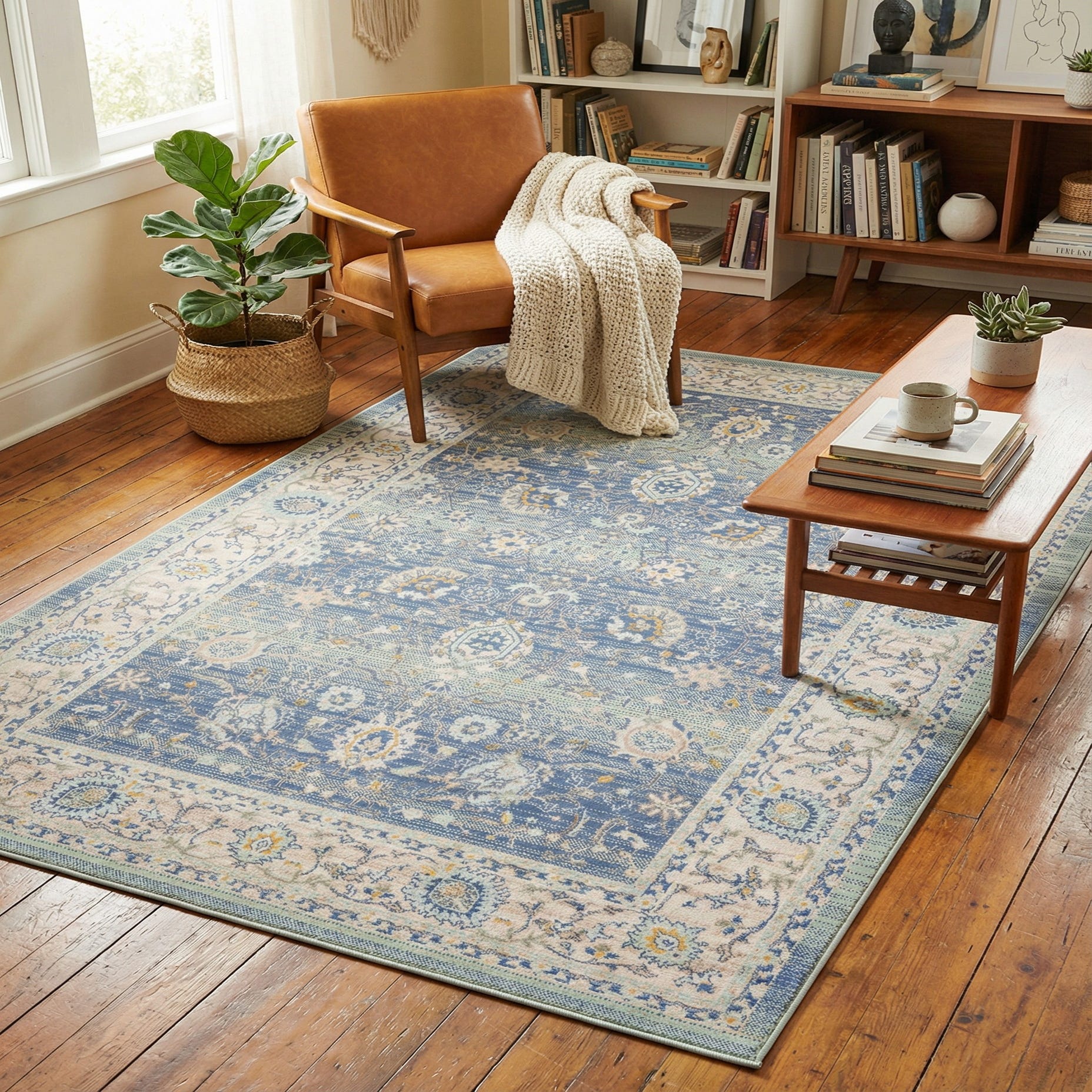 Primary color is French Blue. Colors in this rug include: French Blue, Ivory, Light Blue, Gold, Gray, Light Green.