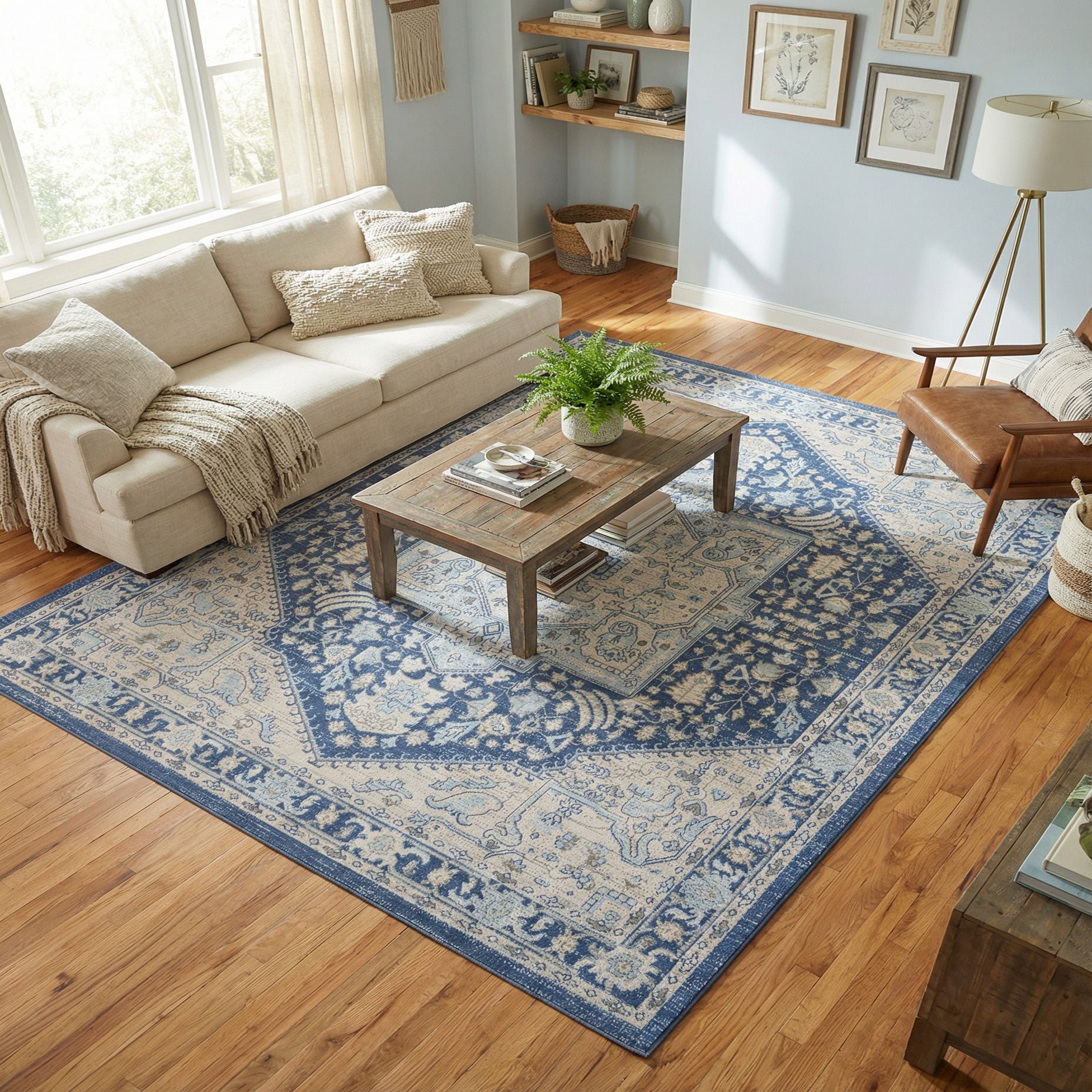 Primary color is French Blue. Colors in this rug include: French Blue, Ivory, Light Blue, Gray.
