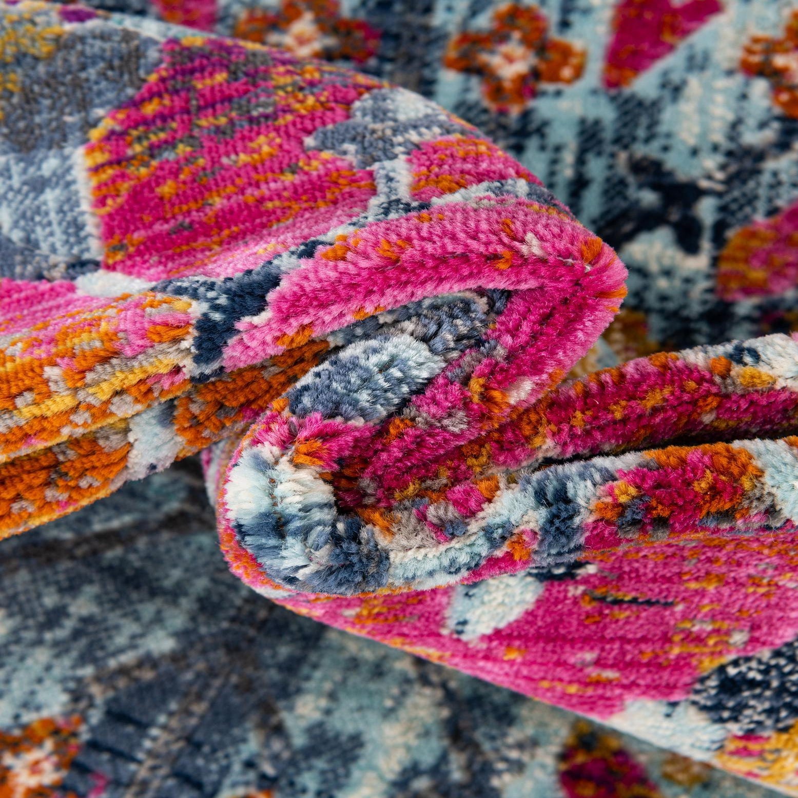 Primary color is Fuchsia. Colors in this rug include: Fuchsia, Gold, Gray, Violet, Ivory, Light Blue, Blue.