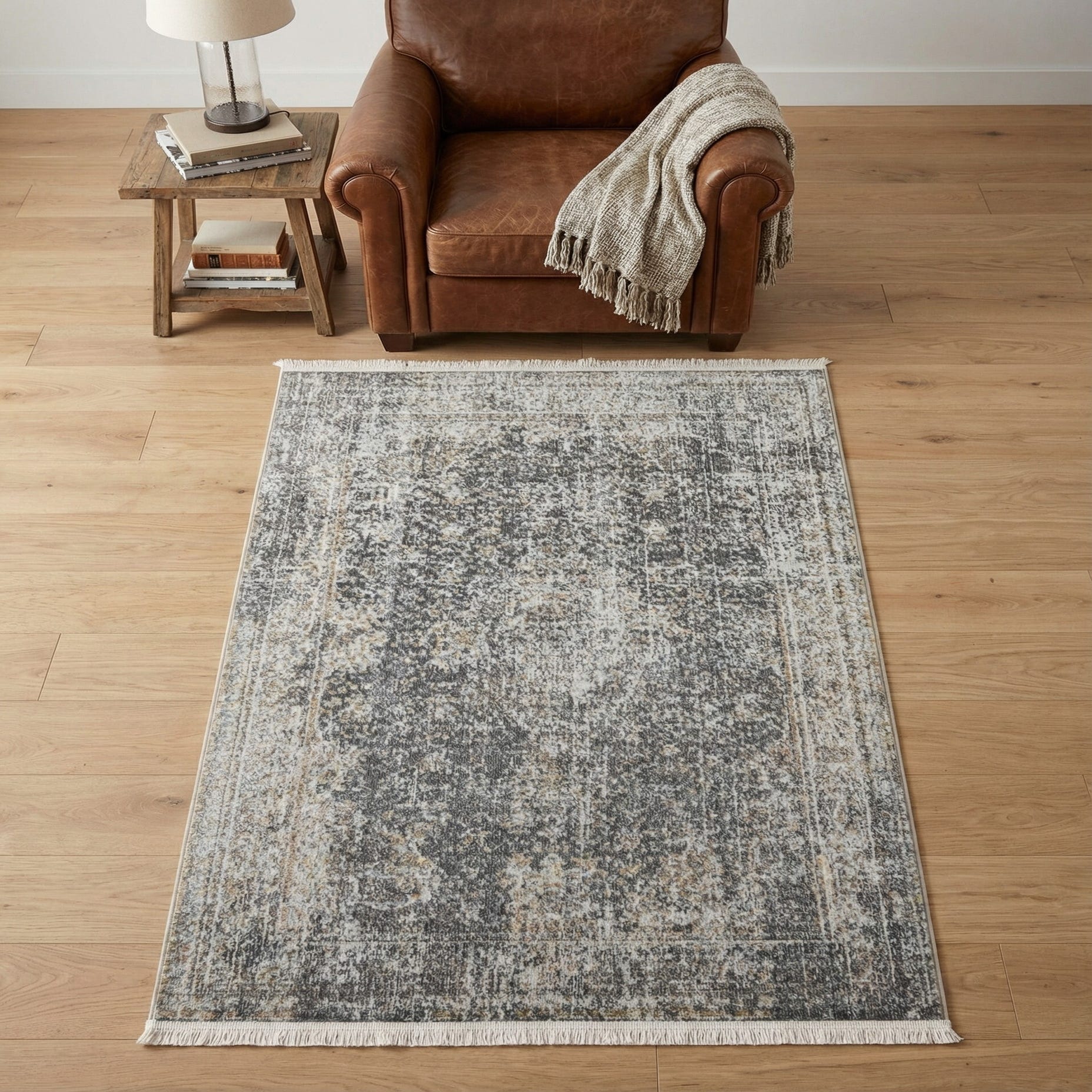 Primary color is Fume Gray. Colors in this rug include: Fume Gray, Brown, Ivory, Gray, Tan, Light Blue.