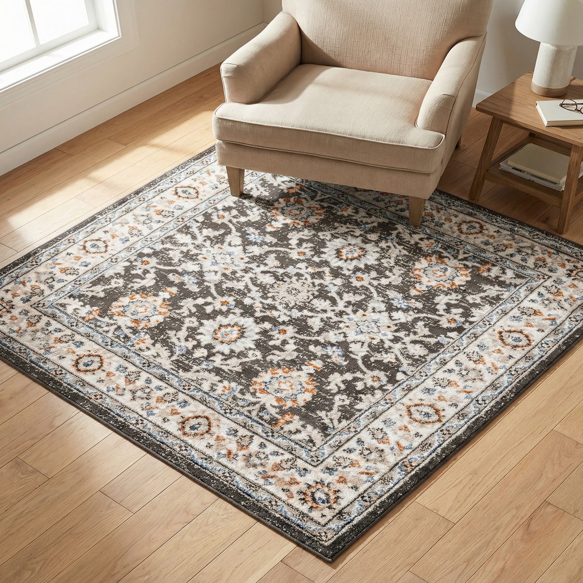 Primary color is Fume Gray. Colors in this rug include: Fume Gray, Ivory, Light Brown, Light Blue, Terracotta.