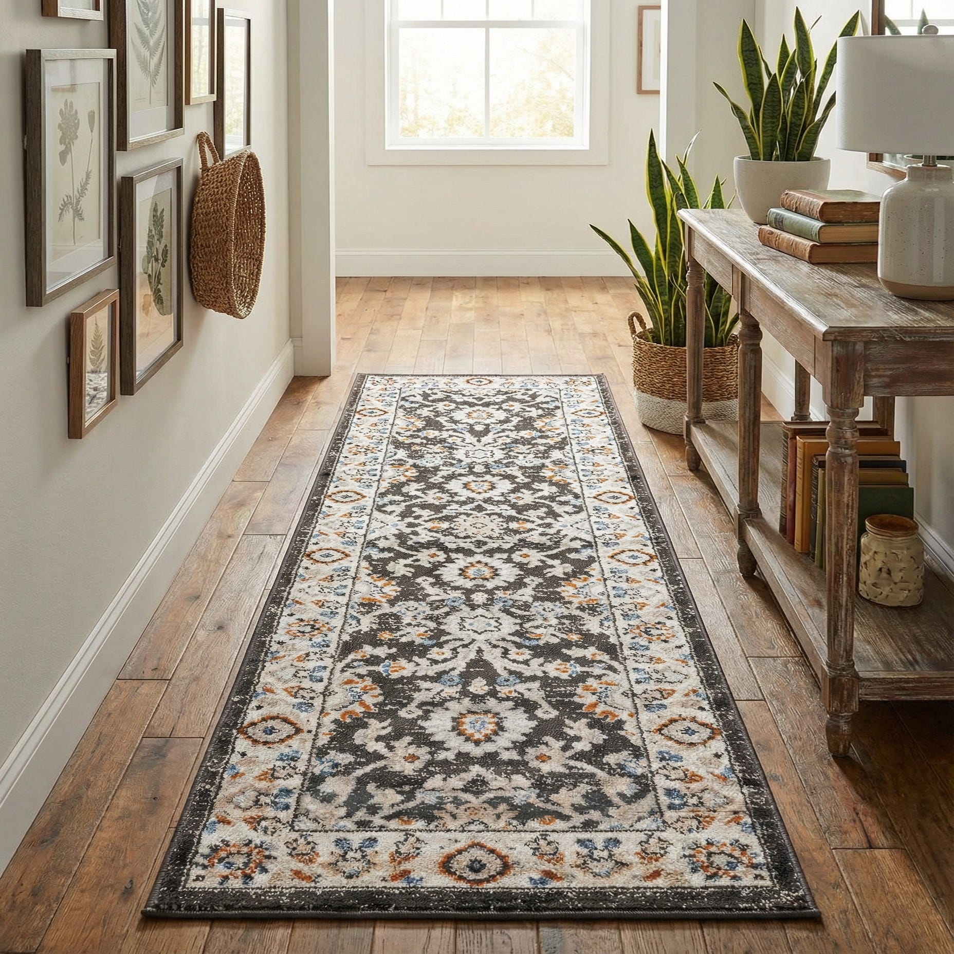 Primary color is Fume Gray. Colors in this rug include: Fume Gray, Ivory, Light Blue, Light Brown, Terracotta.