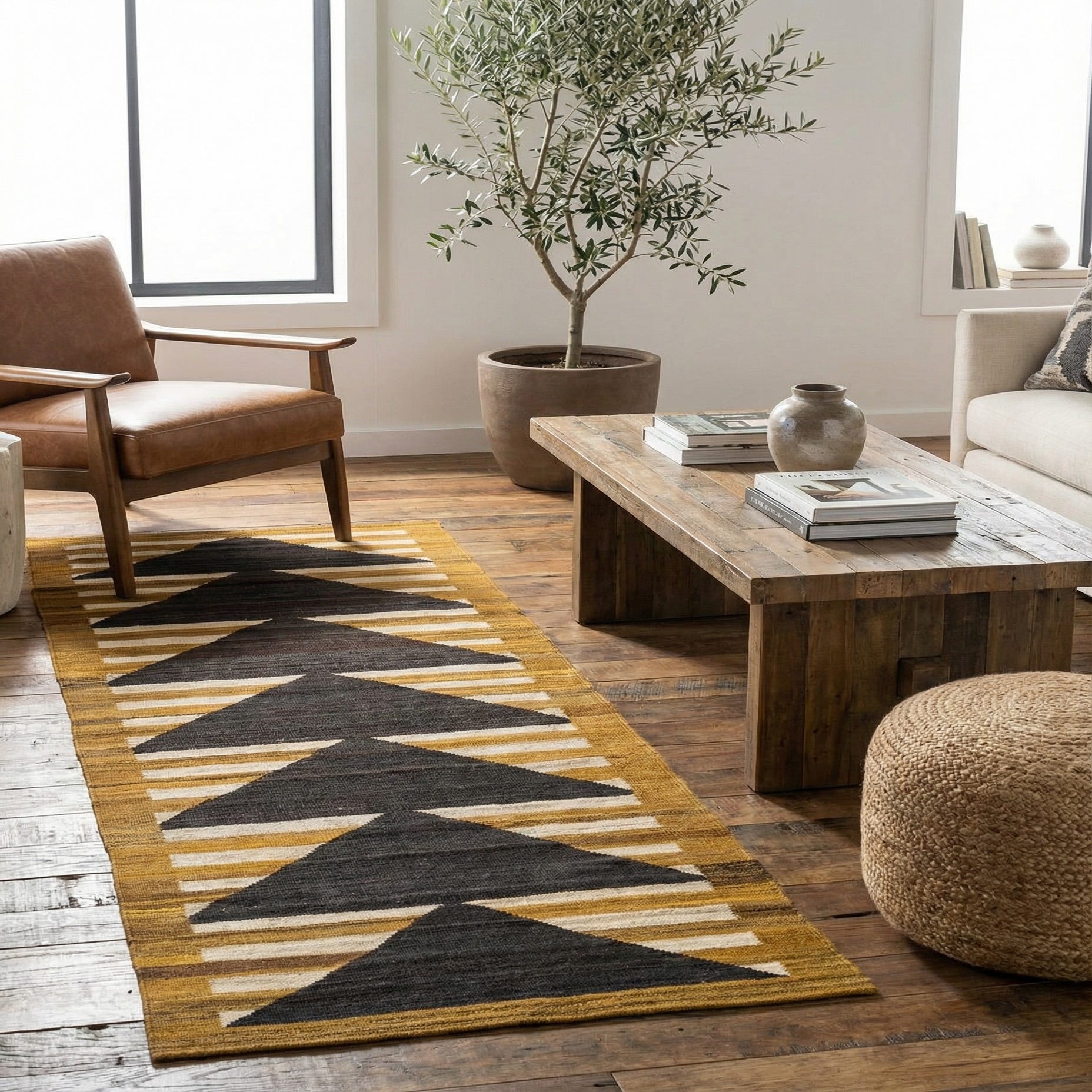 Primary color is Gold. Colors in this rug include: Gold, Black, Brown, Beige.