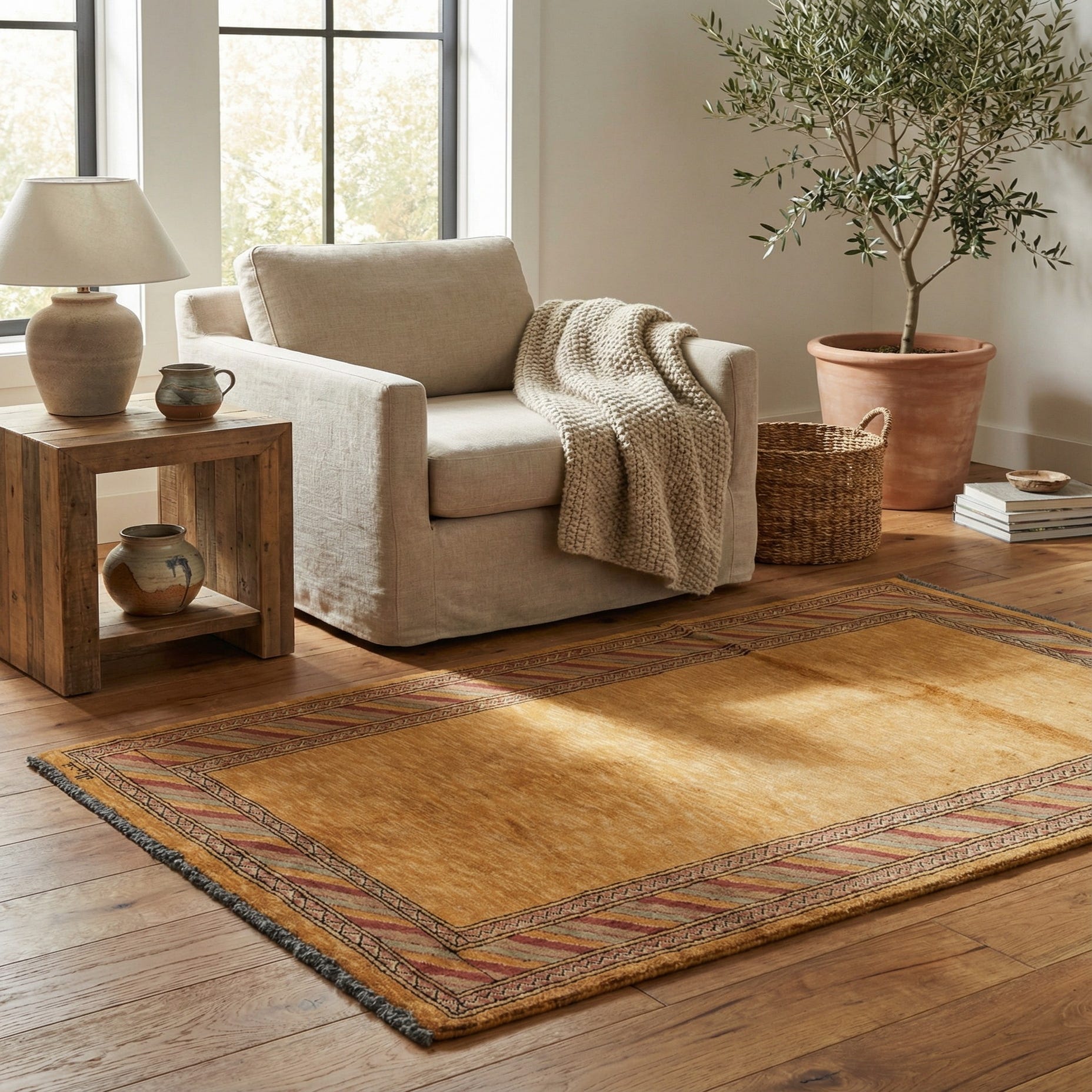 Primary color is Gold. Colors in this rug include: Gold, Red, Gray, Black, Beige.