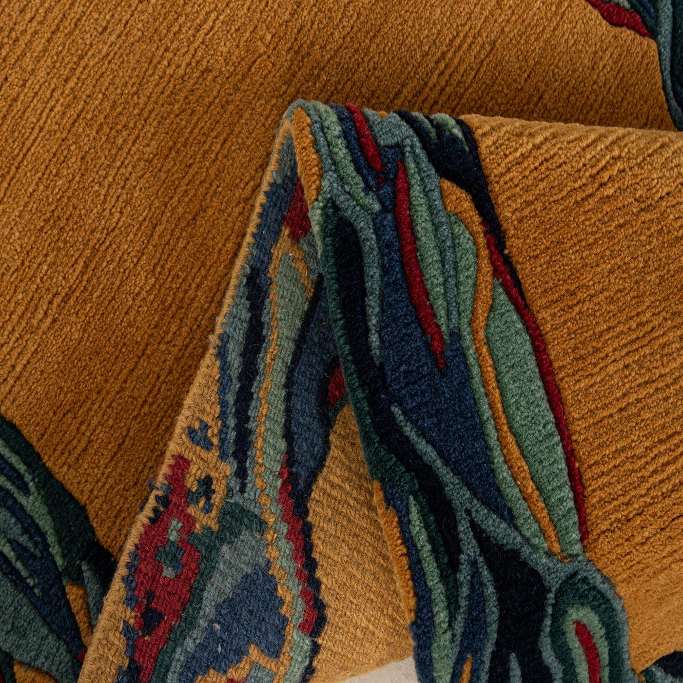 Primary color is Gold. Colors in this rug include: Gold, Blue, Navy Blue, Green, Red, Light Blue.