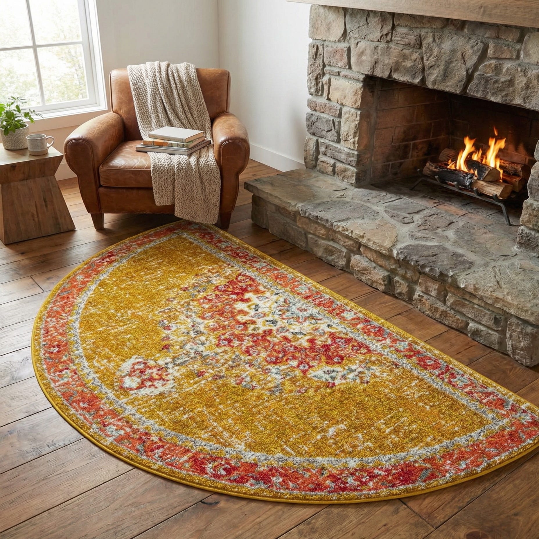Primary color is Gold. Colors in this rug include: Gold, Brown, Gray, Ivory, Light Blue, Orange, Red.