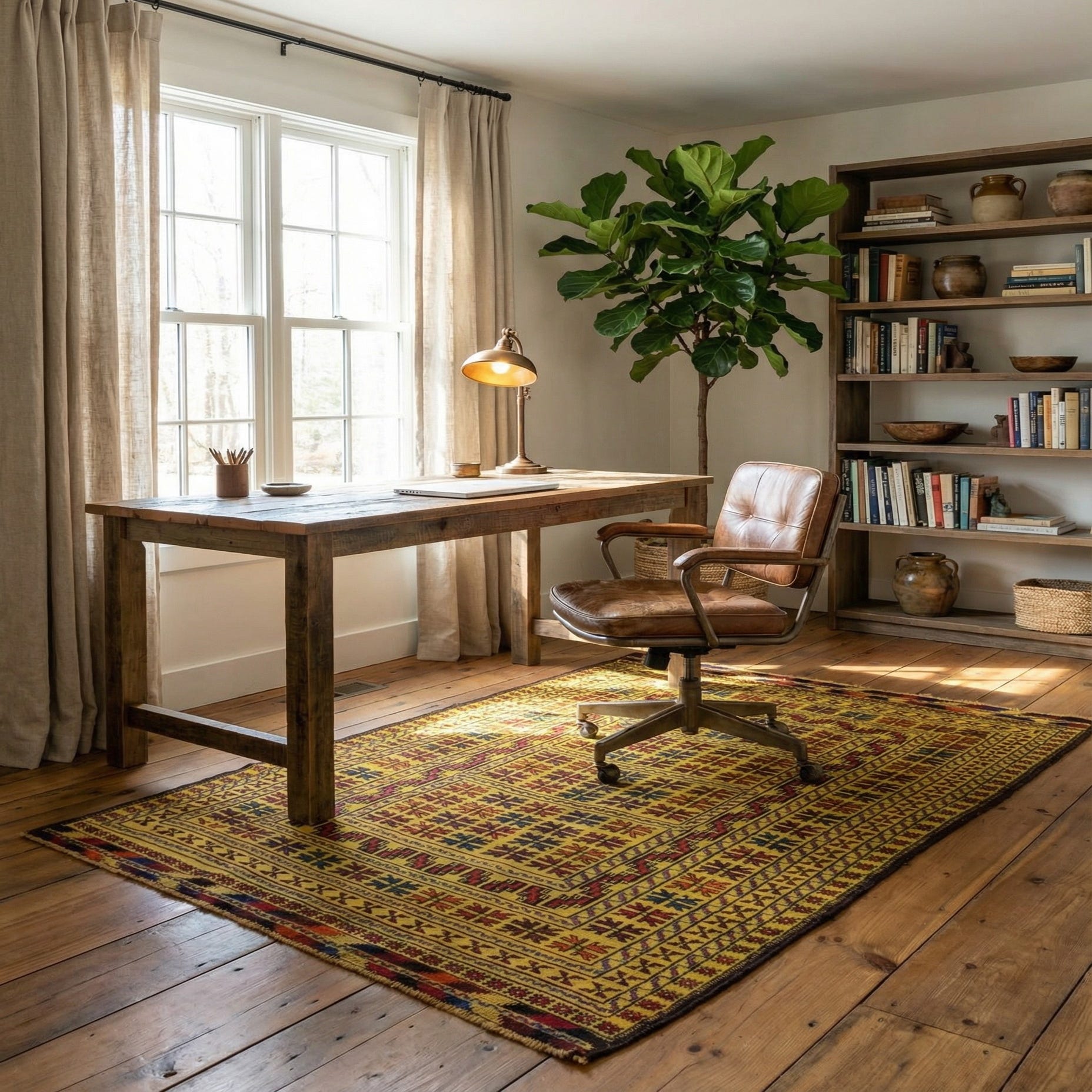 Primary color is Gold. Colors in this rug include: Gold, Beige, Black, Blue, Burgundy, Orange, Rust Red.