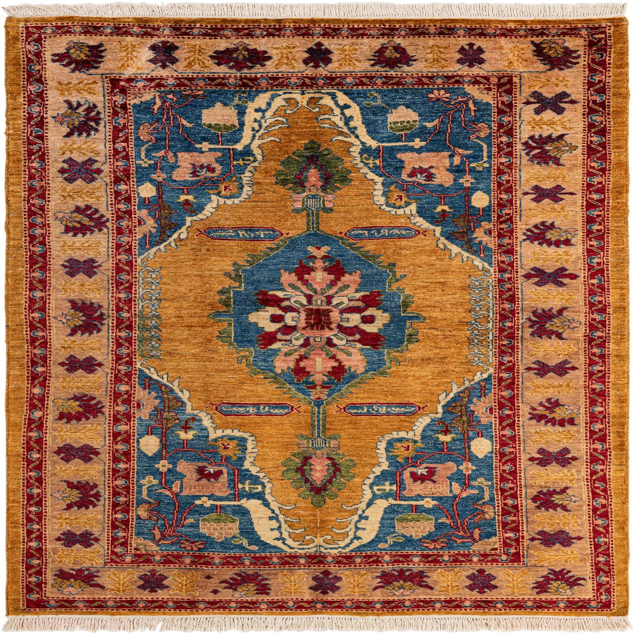 Primary color is Gold. Colors in this rug include: Gold, Beige, Black, Blue, Brown, Green, Red, Pink.