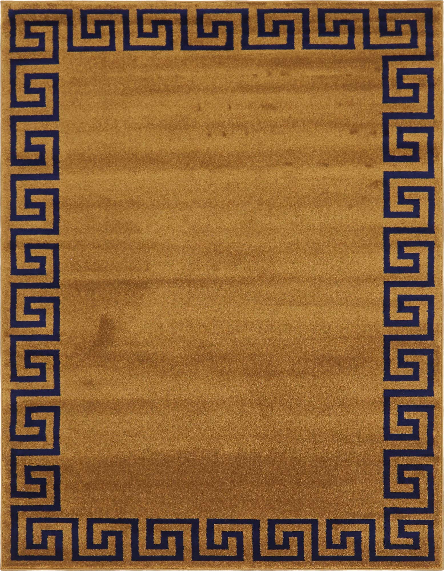 Primary color is Gold. Colors in this rug include: Gold, Navy Blue.