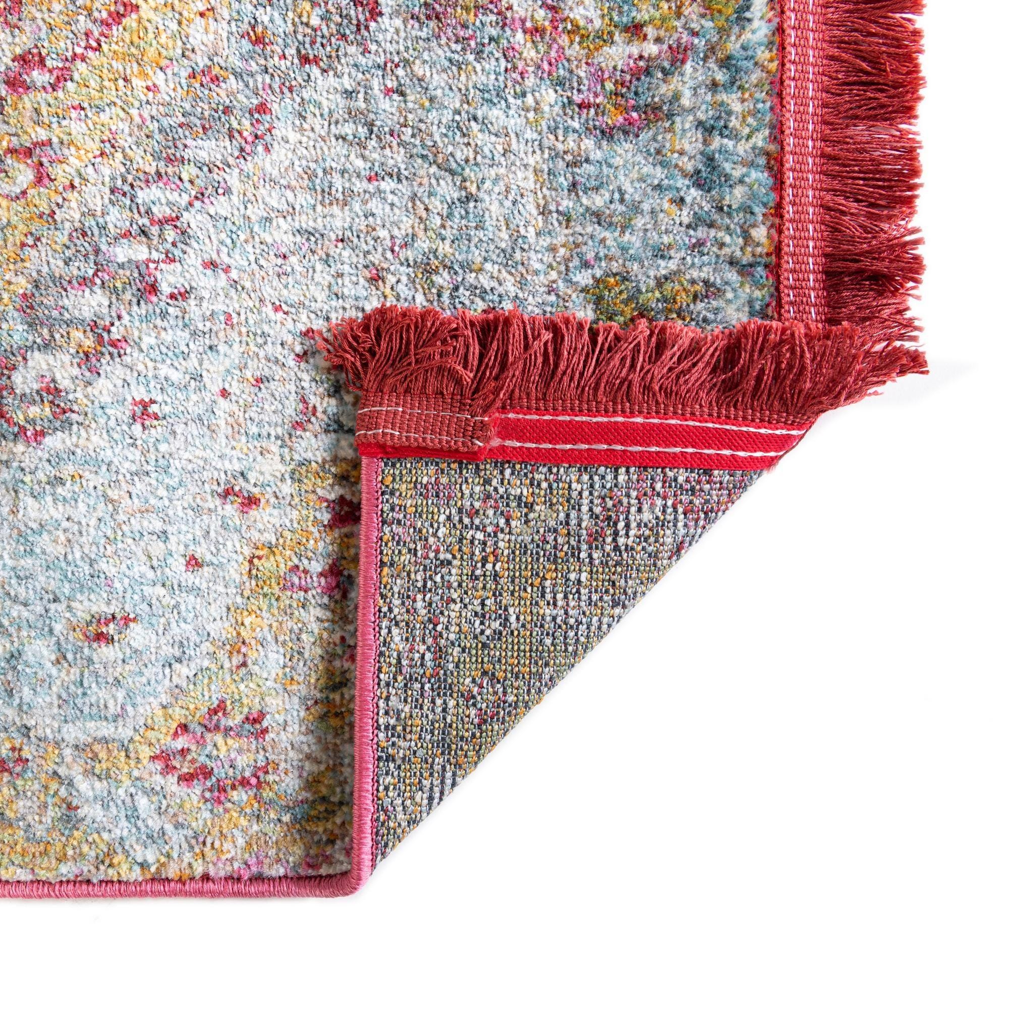 Primary color is Gold. Colors in this rug include: Gold, Green, Ivory, Light Blue, Red, Teal, Pink.