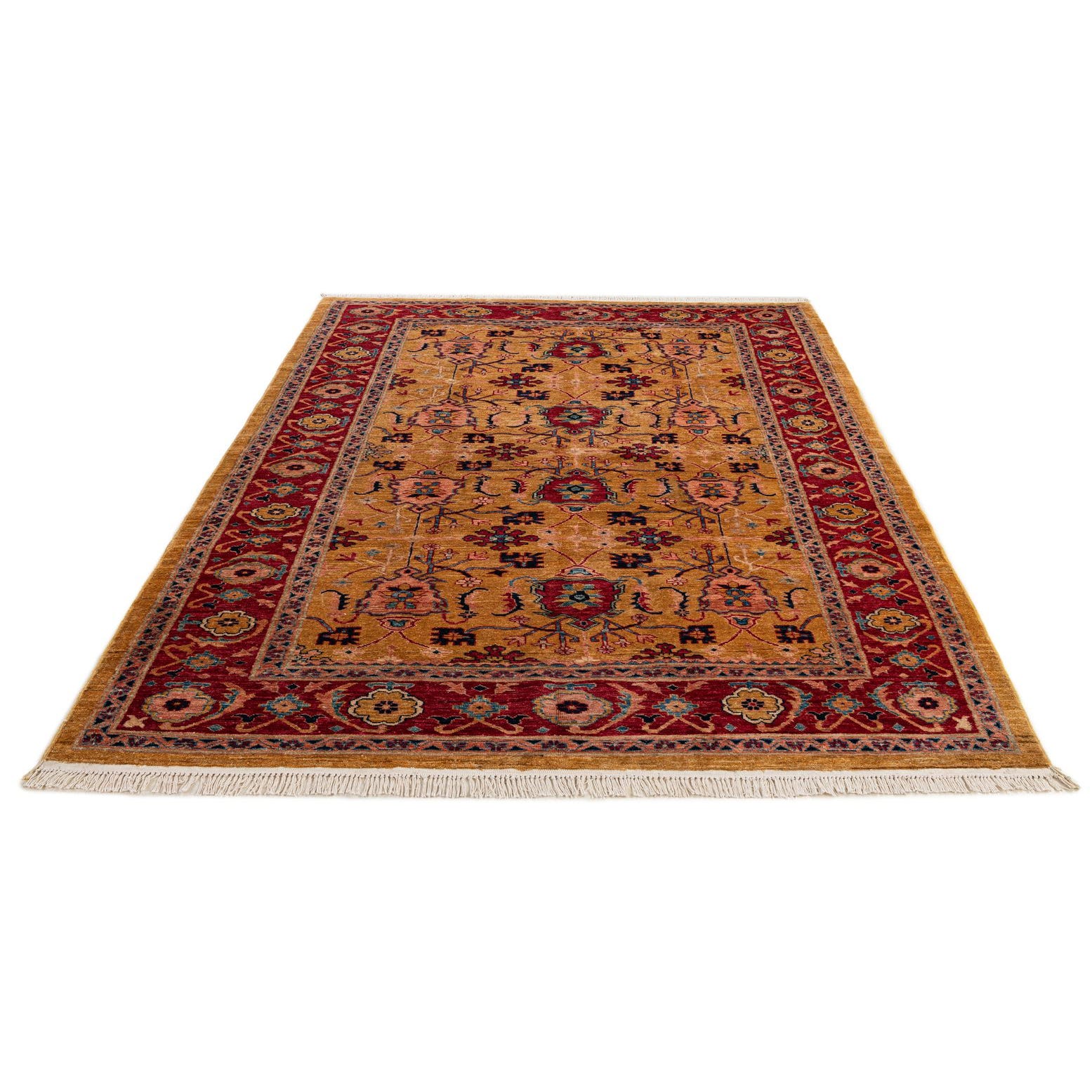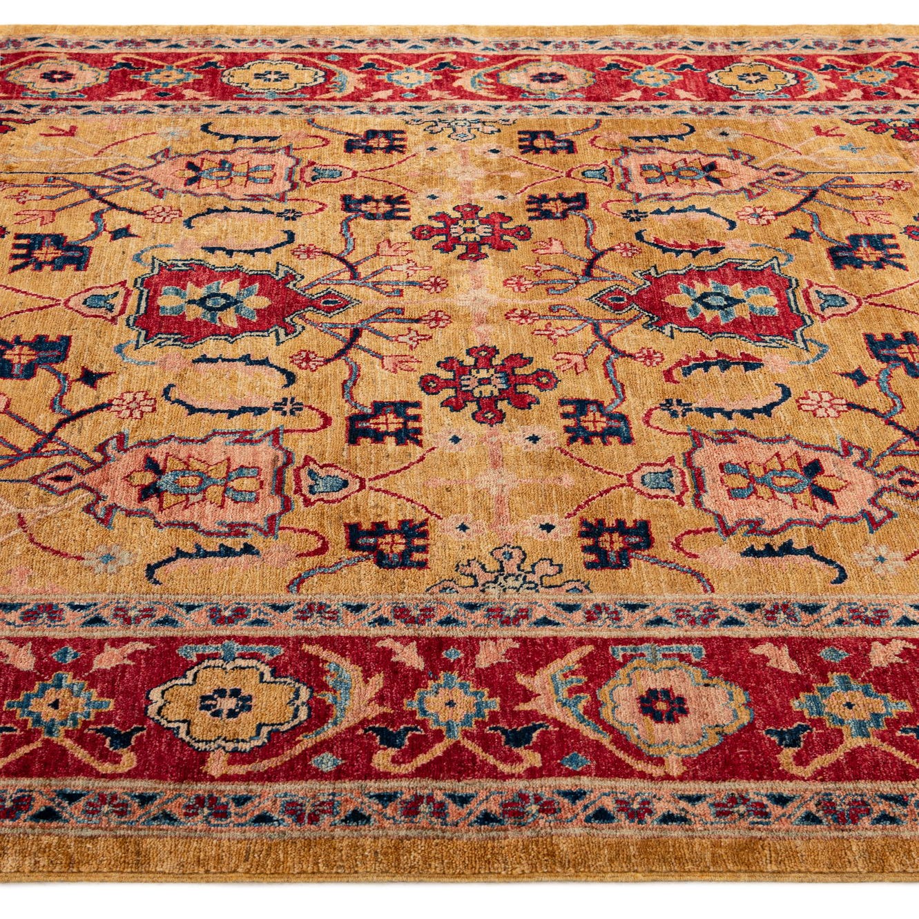 Primary color is Gold. Colors in this rug include: Gold, Brown, Navy Blue, Red, Green, Peach.