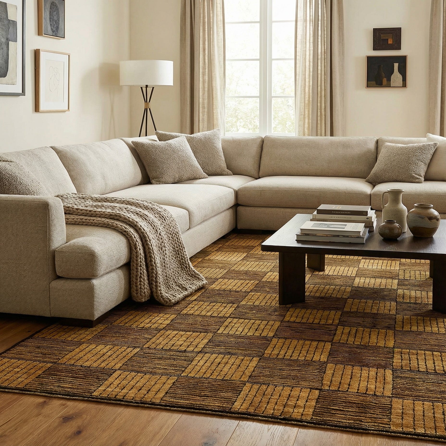 Primary color is Gold. Colors in this rug include: Gold, Brown, Navy Blue.