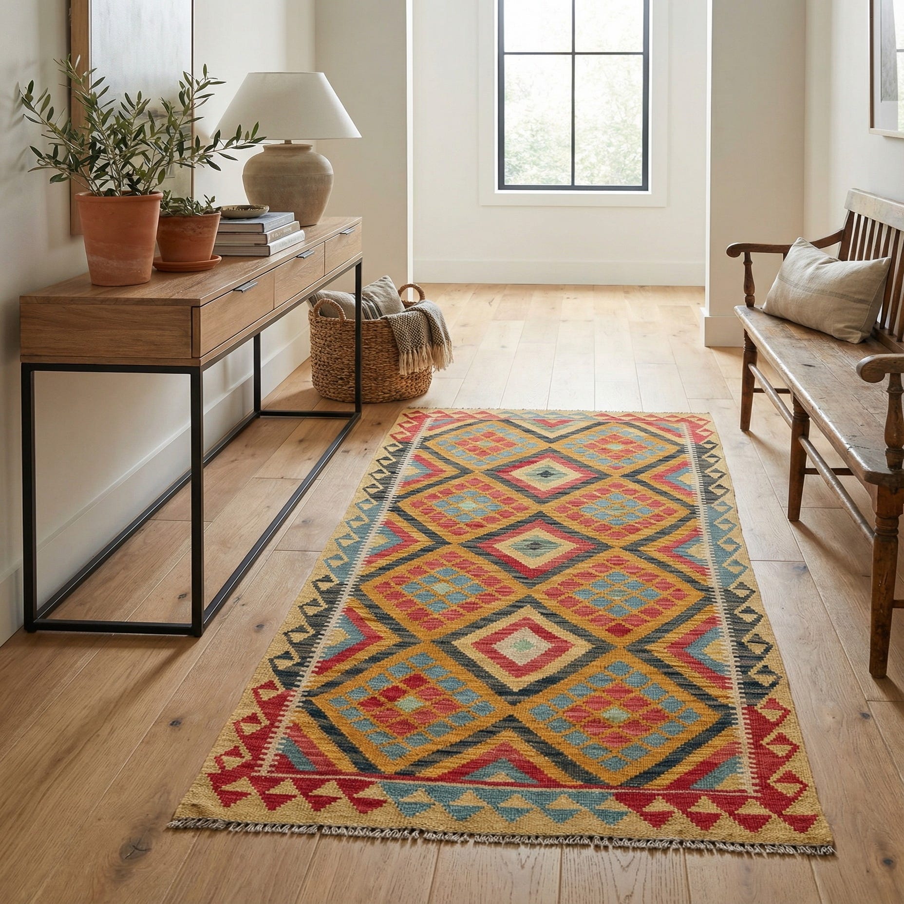 3' 4 x 6' 8 Hand Woven Kilim Maymana Wool Runner Rug