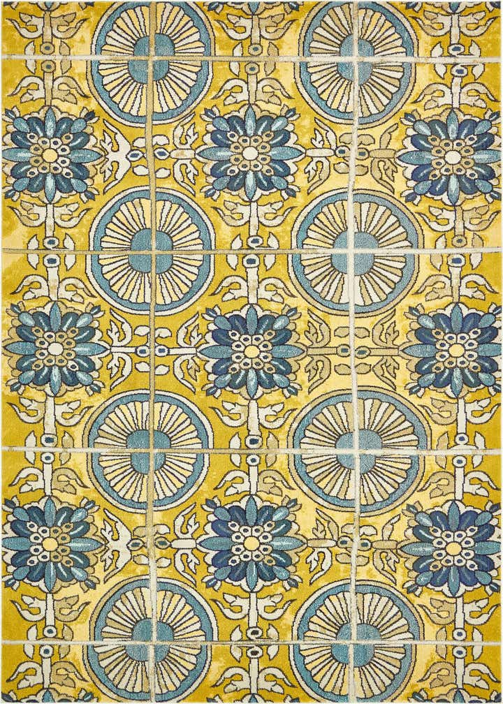 Primary color is Gold. Colors in this rug include: Gold, Blue, Navy Blue, Beige, Brown.