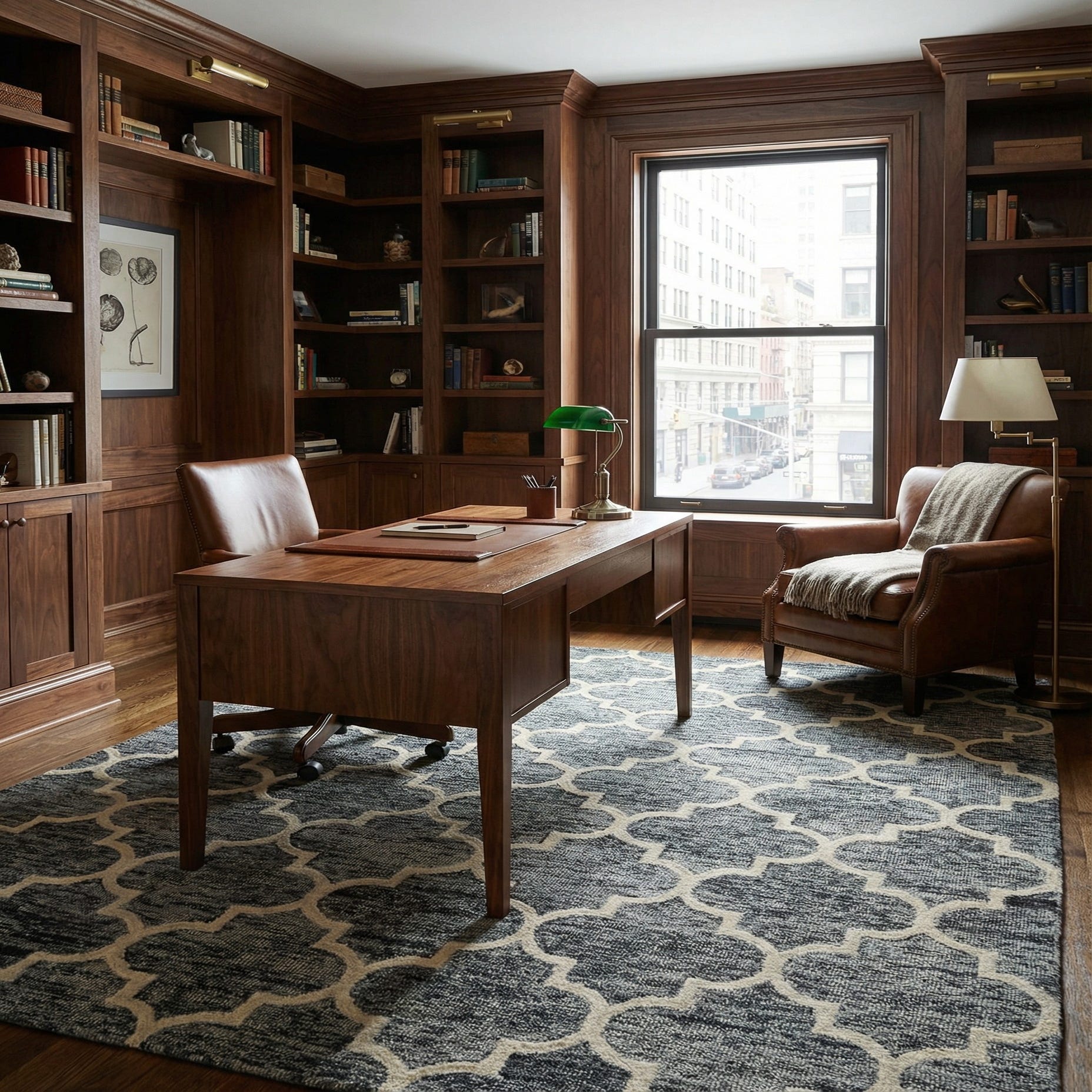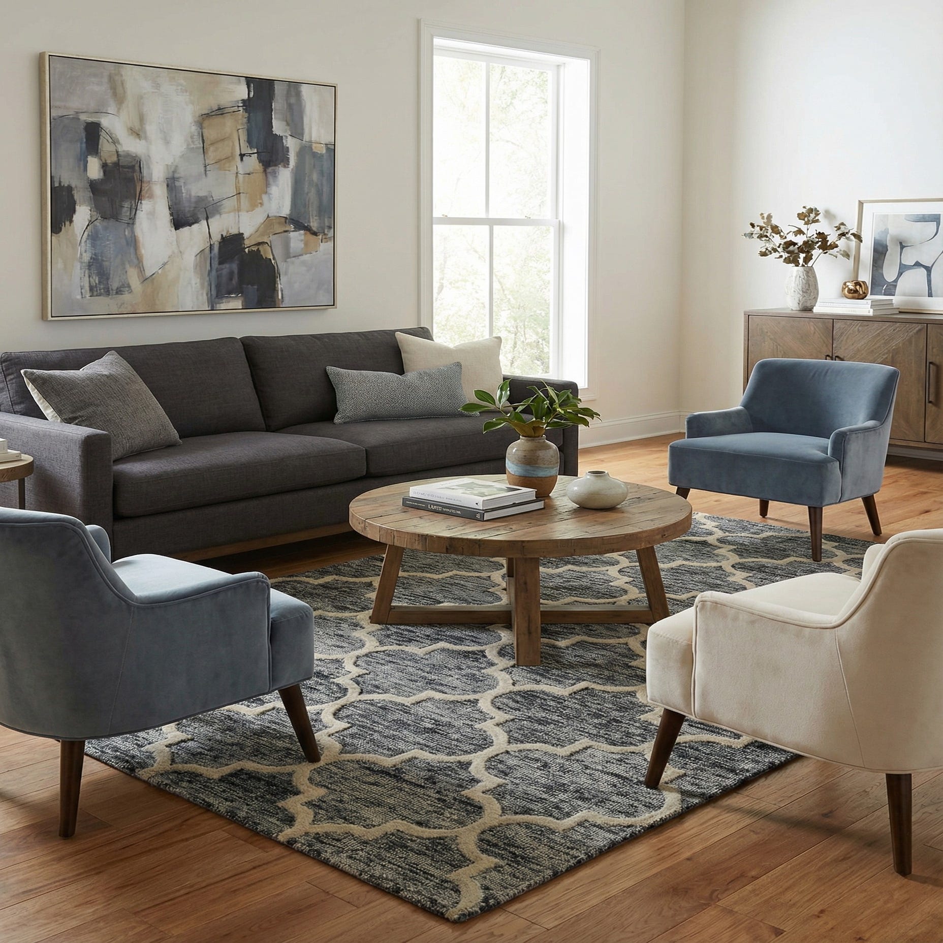 Primary color is Graphite Gray. Colors in this rug include: Graphite Gray, Black, Ivory.