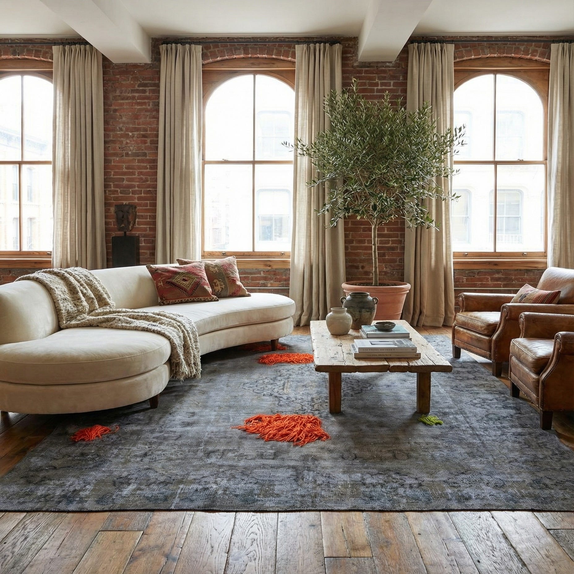 Primary color is Graphite Gray. Colors in this rug include: Graphite Gray, Brown, Orange, Green.