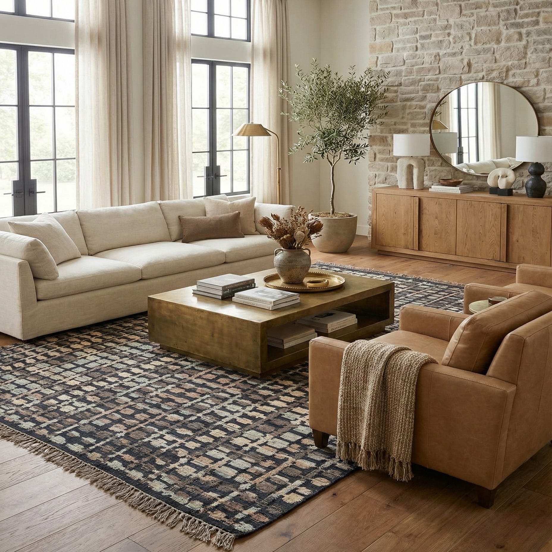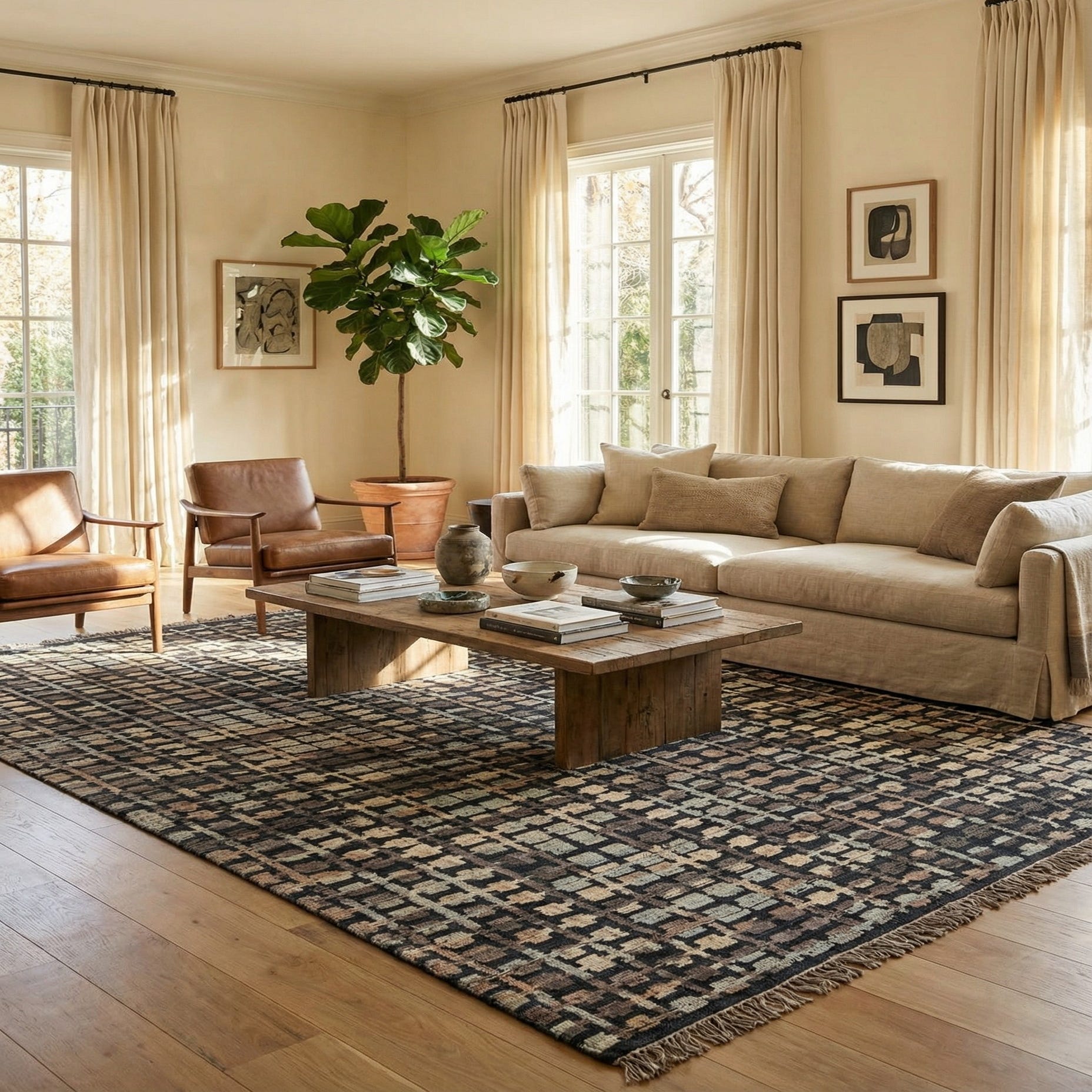 Primary color is Graphite Gray. Colors in this rug include: Graphite Gray, Beige, Brown, Light Green, Light Brown.