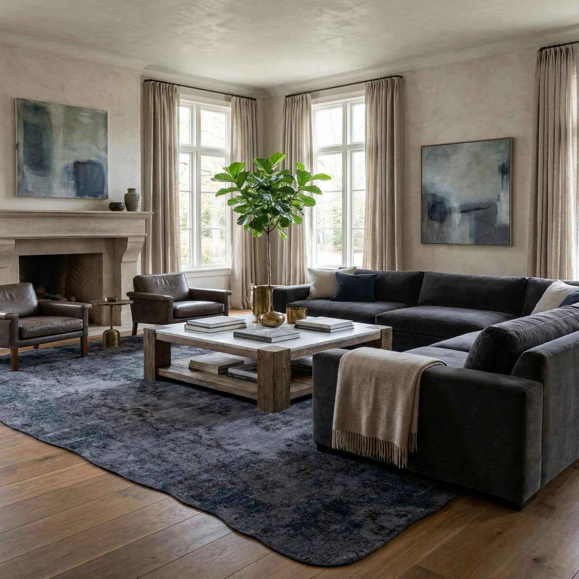 Primary color is Graphite Gray. Colors in this rug include: Graphite Gray, Black, Navy Blue.