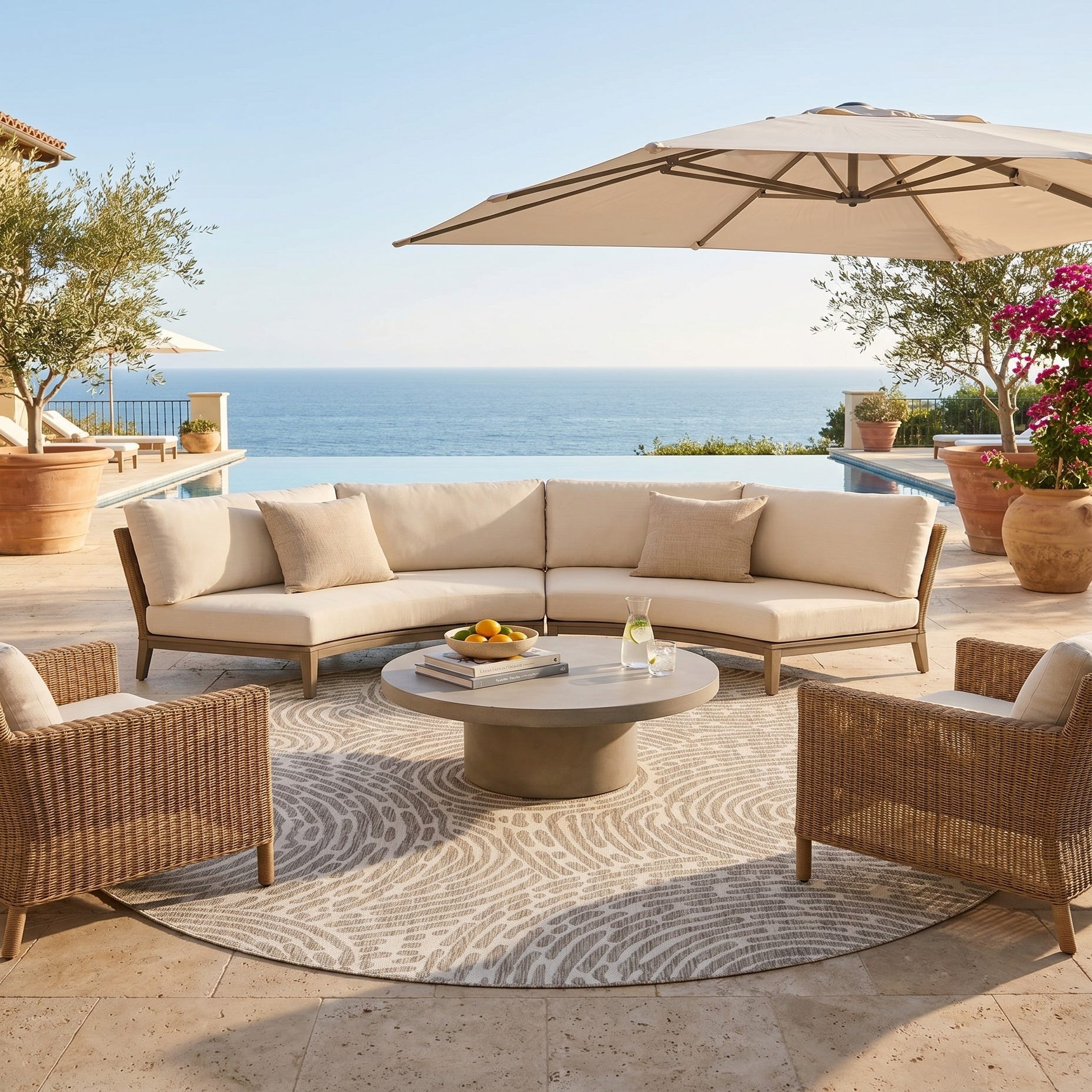 Love the contemporary look of this rug! We are so happy we chose this to accent the blue of our pool with our living area on our lanai. We still are going to add a few more pillows but love the rug to add color.