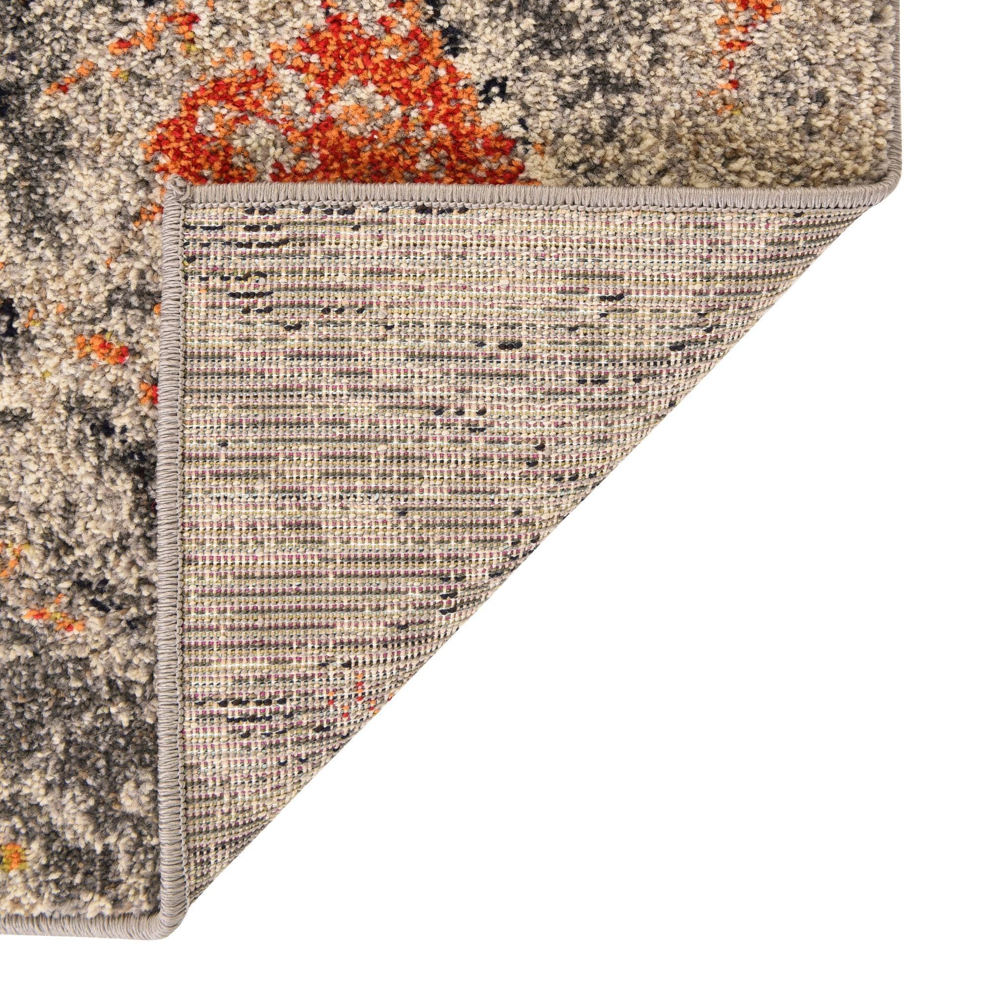 Primary color is Gray. Colors in this rug include: Gray, Black, Blue, Navy Blue, Orange, Red, Beige.