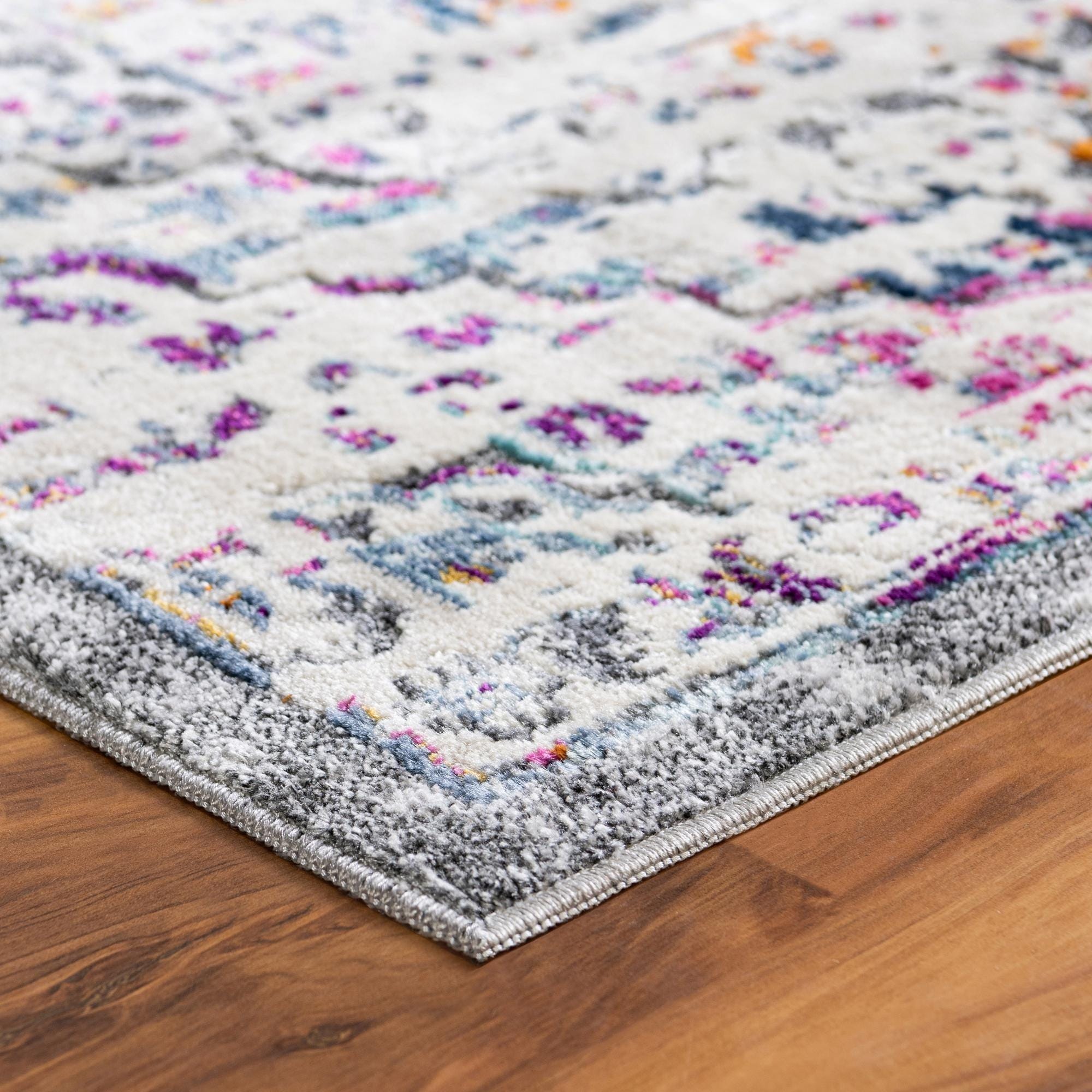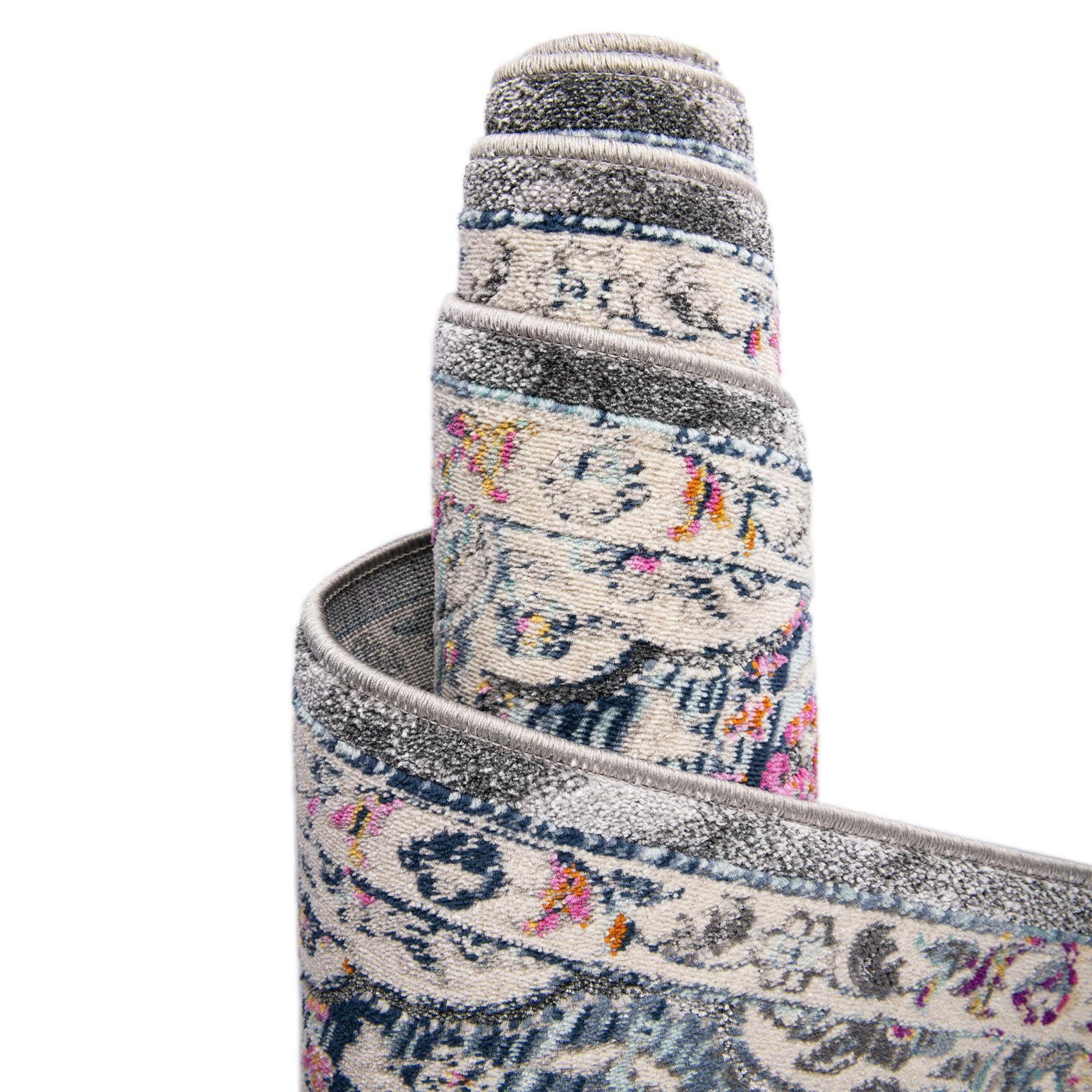 Primary color is Gray. Colors in this rug include: Gray, Ivory, Gold, Peach, Violet, Navy Blue, Light Blue.
