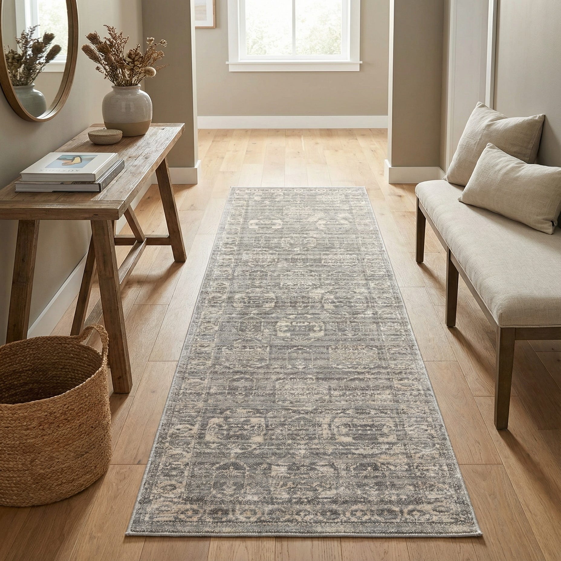 Primary color is Gray. Colors in this rug include: Gray, Ivory.