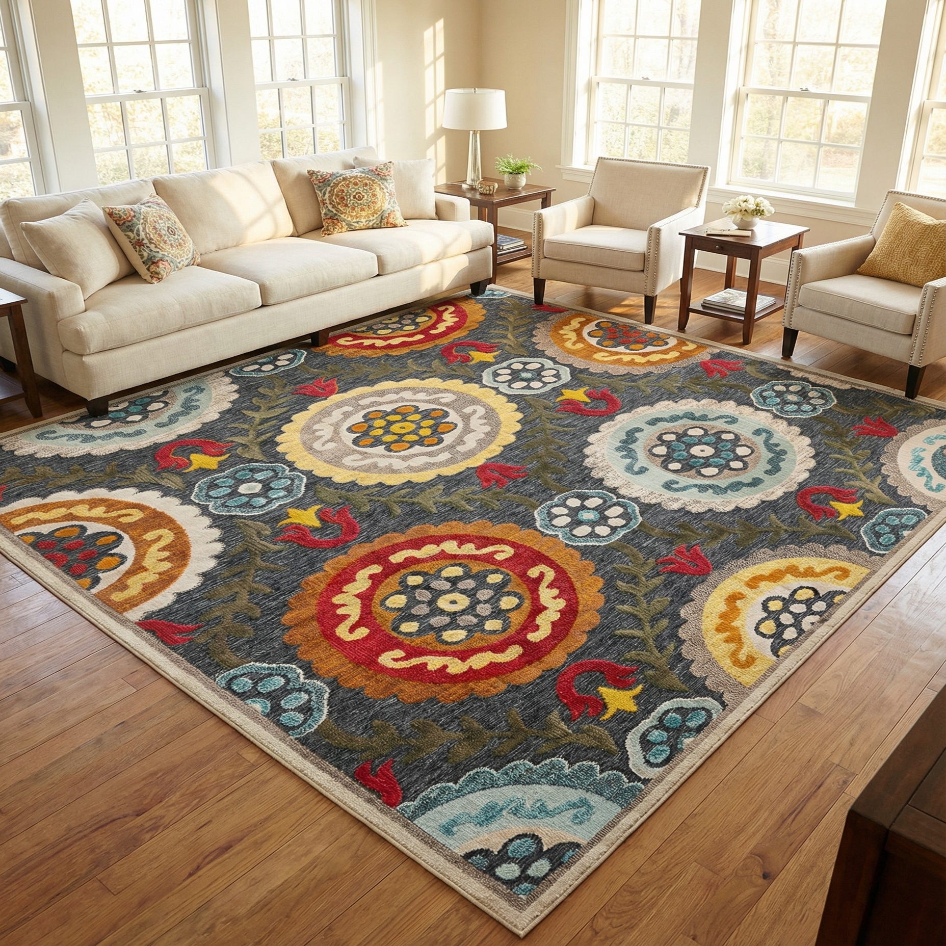 Primary color is Gray. Colors in this rug include: Gray, Beige, Blue, Ivory, Hunter Green, Light Blue, Light Brown, Red, Yellow, Pink, Orange.