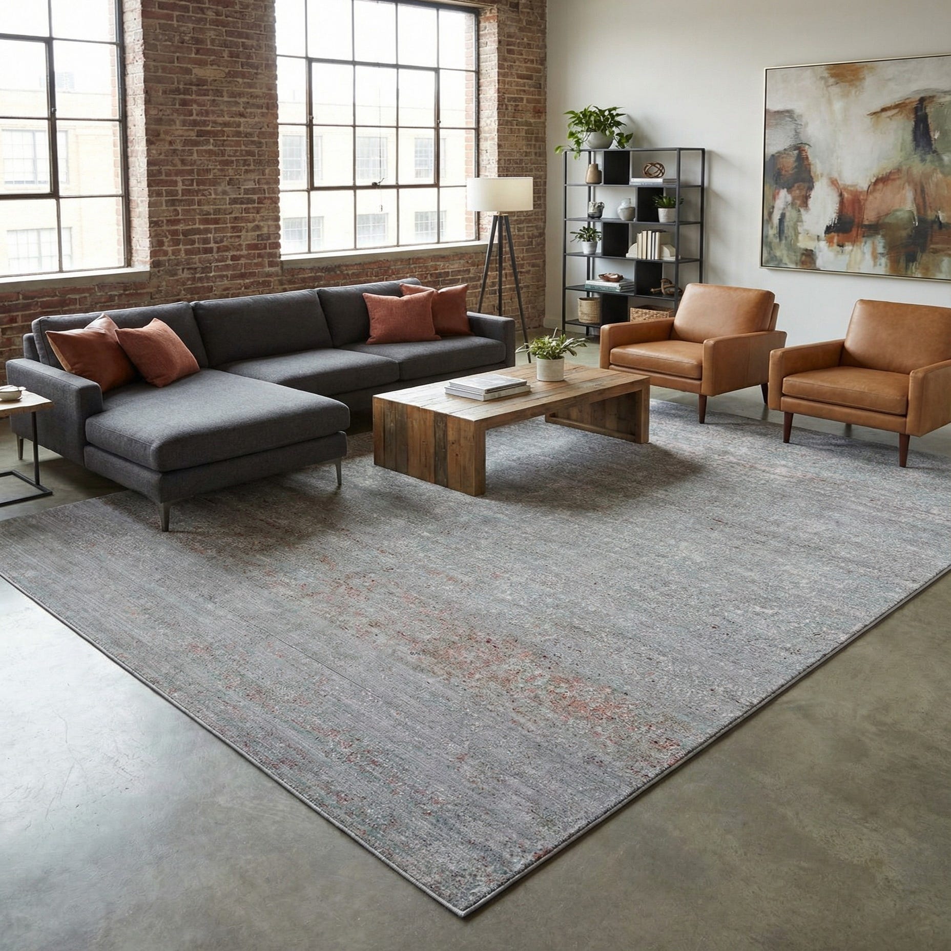 Primary color is Gray. Colors in this rug include: Gray, Burgundy, Green, Light Blue, Peach, Puce, Yellow, Ivory.