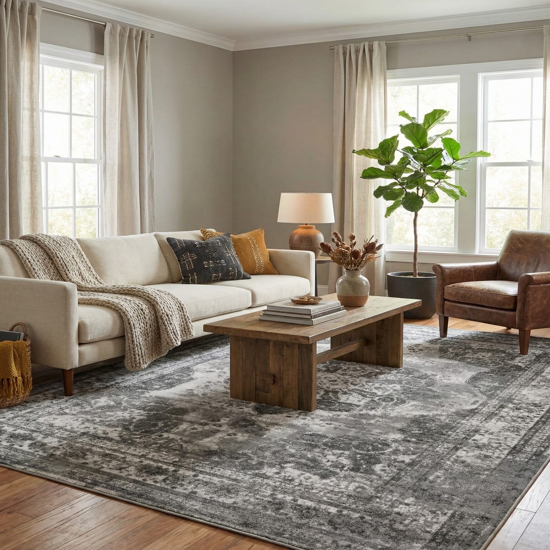 Primary color is Gray. Colors in this rug include: Gray, Beige.