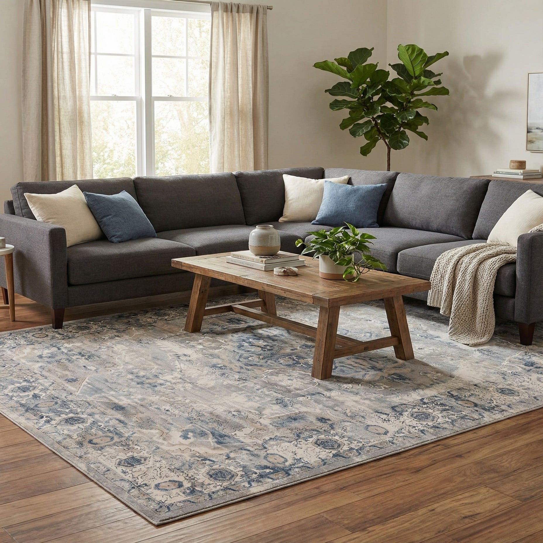 Primary color is Gray. Colors in this rug include: Gray, Beige, Blue.