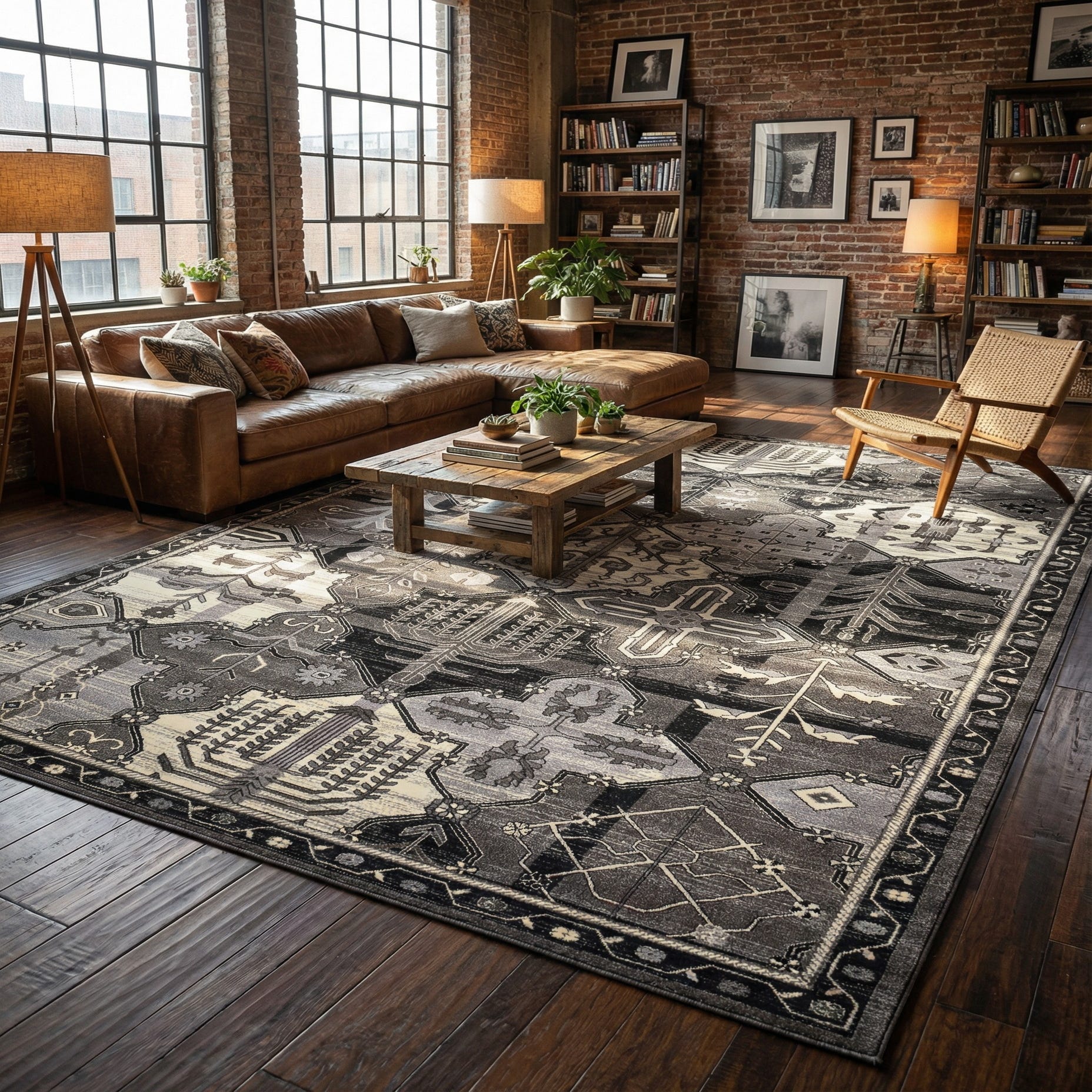 Primary color is Gray. Colors in this rug include: Gray, Black, Ivory, Silver.
