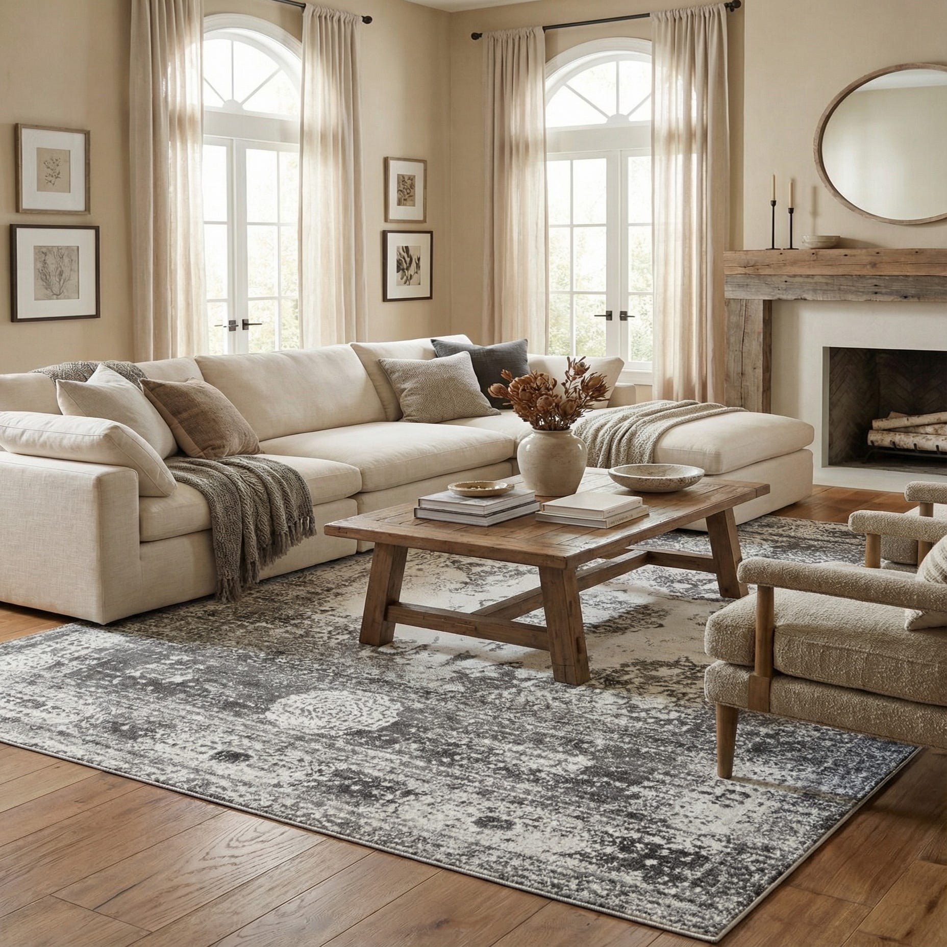 Primary color is Gray. Colors in this rug include: Gray, Ivory.