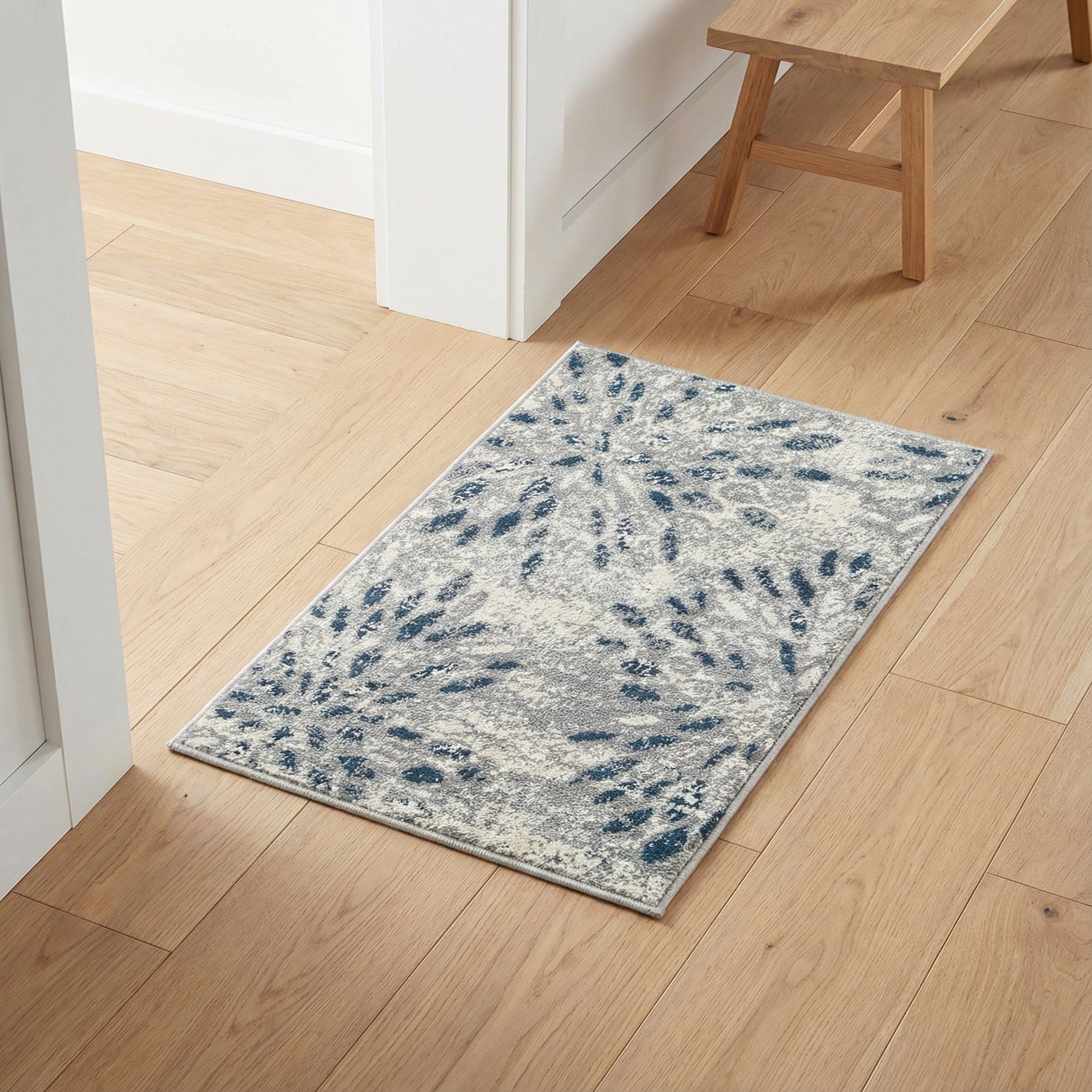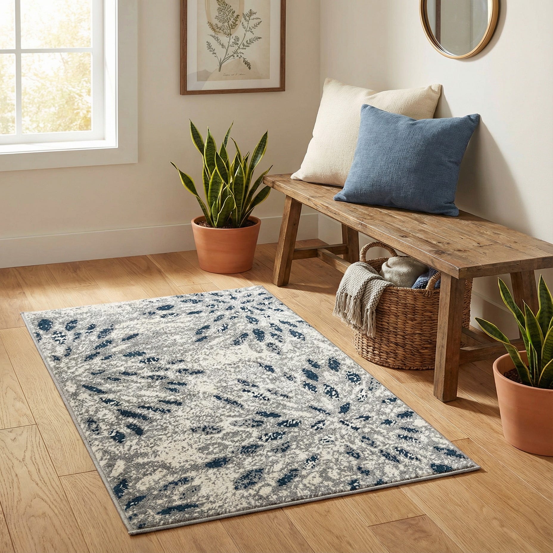 Primary color is Gray. Colors in this rug include: Gray, Ivory, Navy Blue.