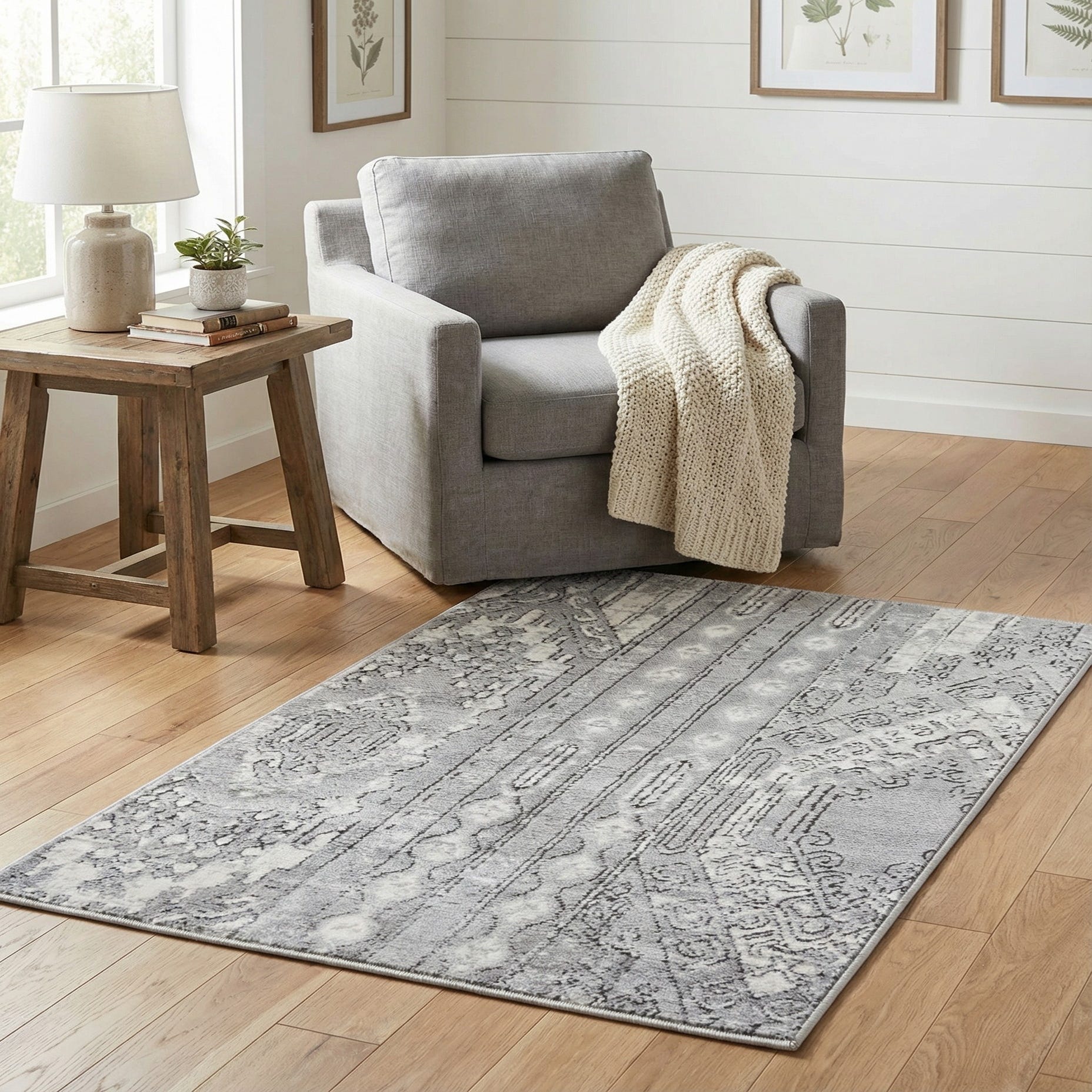 Primary color is Gray. Colors in this rug include: Gray, Beige, Cream.