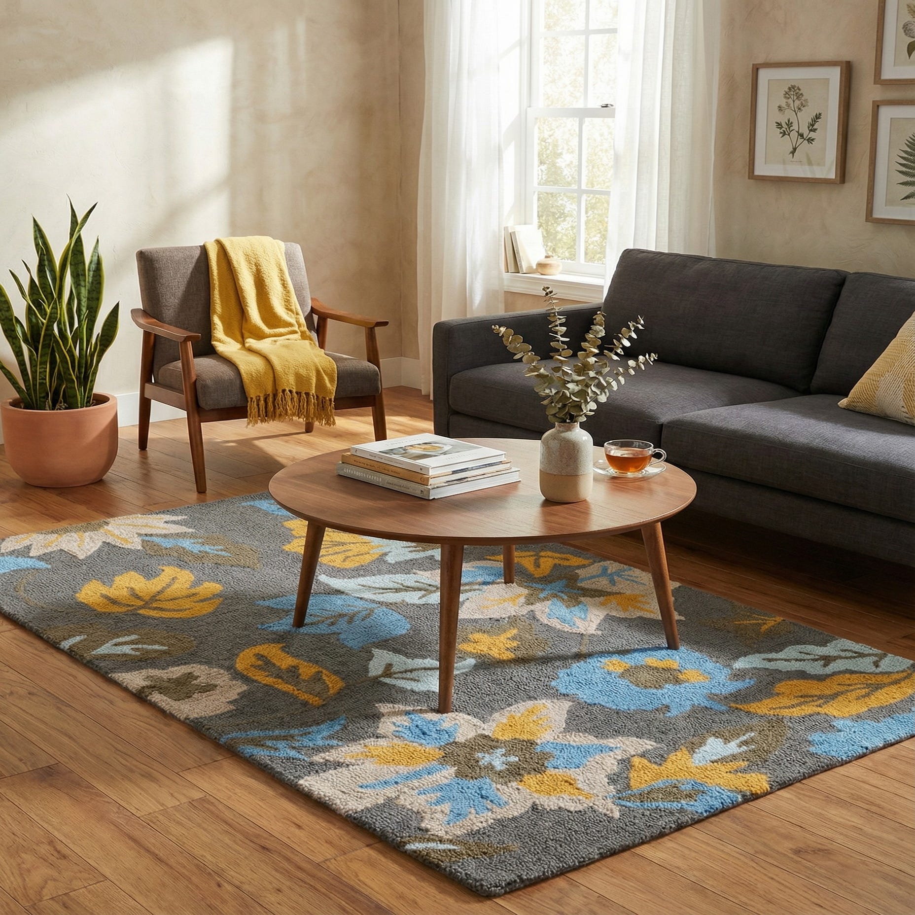 Primary color is Gray. Colors in this rug include: Gray, Yellow, Light Blue, Blue, Beige.