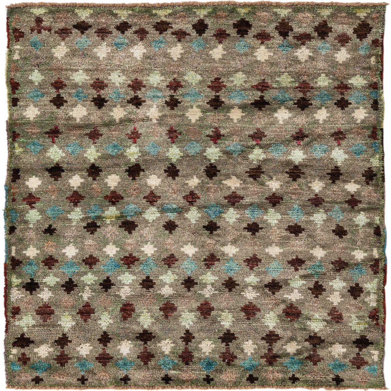 Primary color is Gray. Colors in this rug include: Gray, Tan, Turquoise, Brown, Maroon, Light Blue.