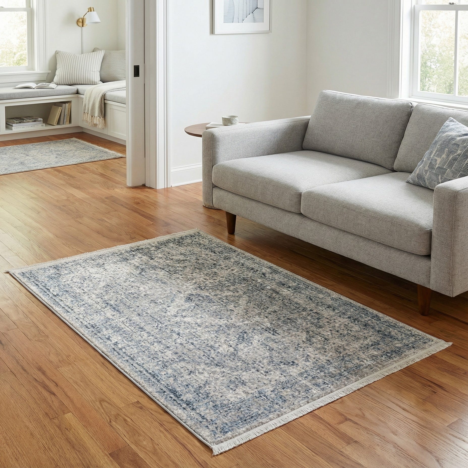 Primary color is Gray. Colors in this rug include: Gray, Ivory, Light Blue, Navy Blue.