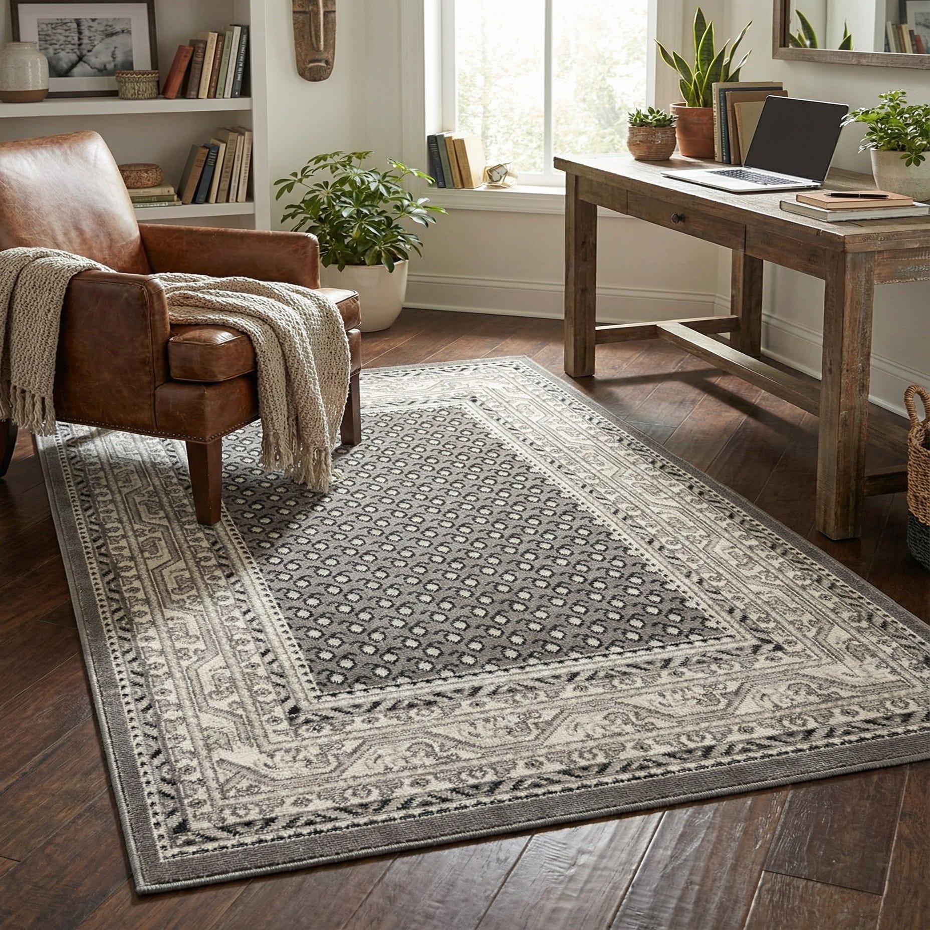 Primary color is Gray. Colors in this rug include: Gray, Black, Ivory.
