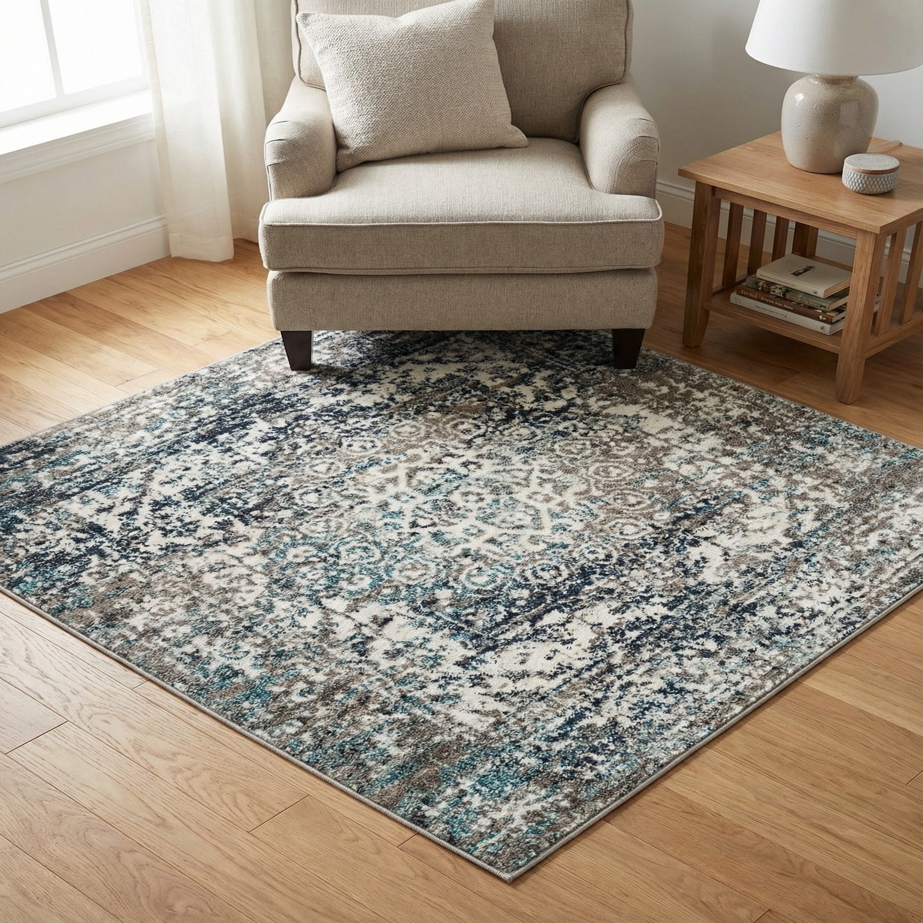 Primary color is Gray. Colors in this rug include: Gray, Blue, Ivory, Navy Blue.