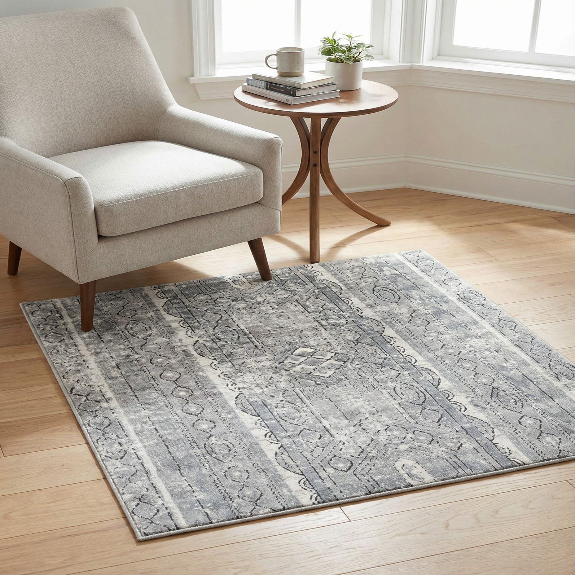 Primary color is Gray. Colors in this rug include: Gray, Ivory.