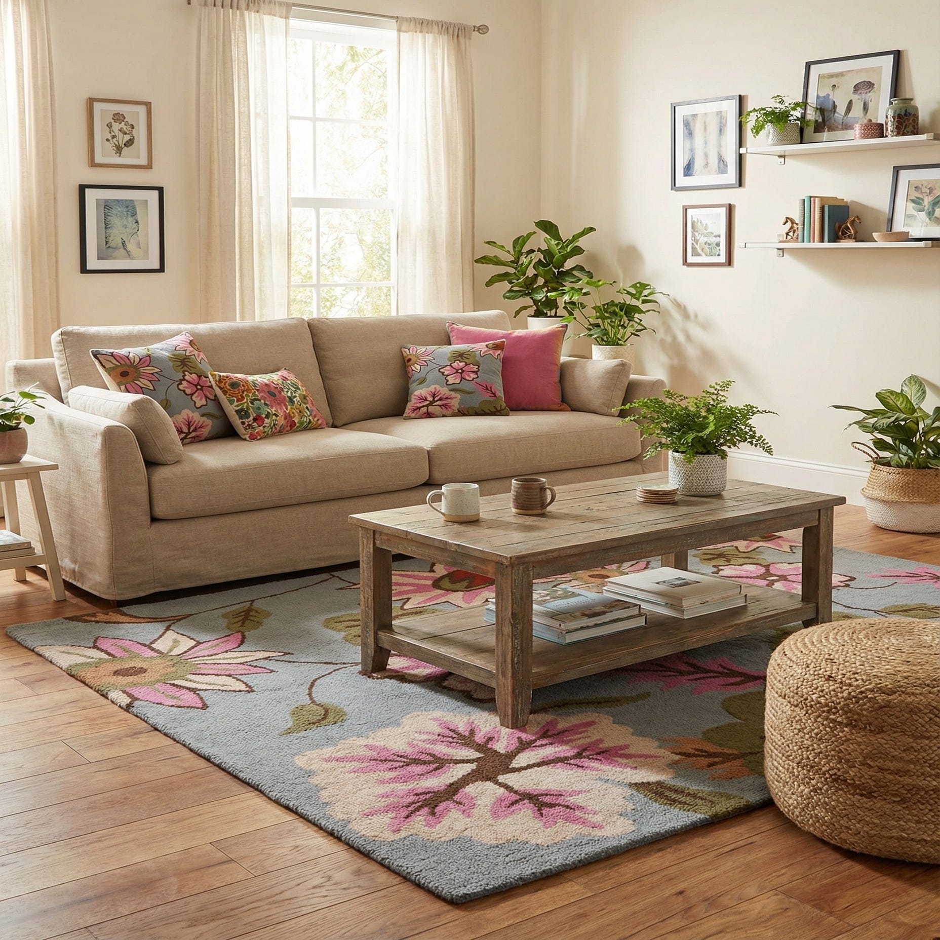 Primary color is Gray. Colors in this rug include: Gray, Brown, Ivory, Olive, Pink, Rust Red.