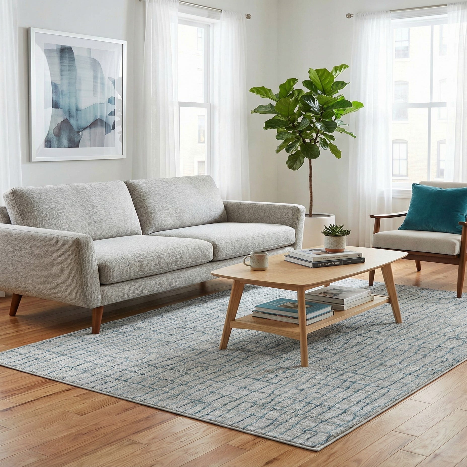 Primary color is Gray. Colors in this rug include: Gray, Ivory, Blue.