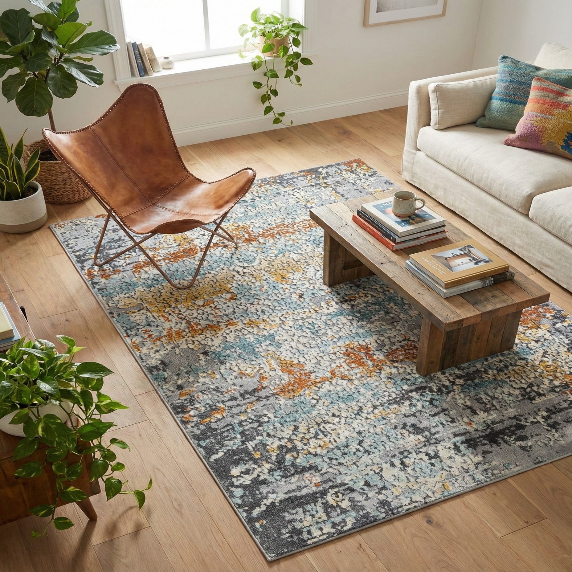 Primary color is Gray. Colors in this rug include: Gray, Gold, Ivory, Light Blue, Tan, Teal, Terracotta.