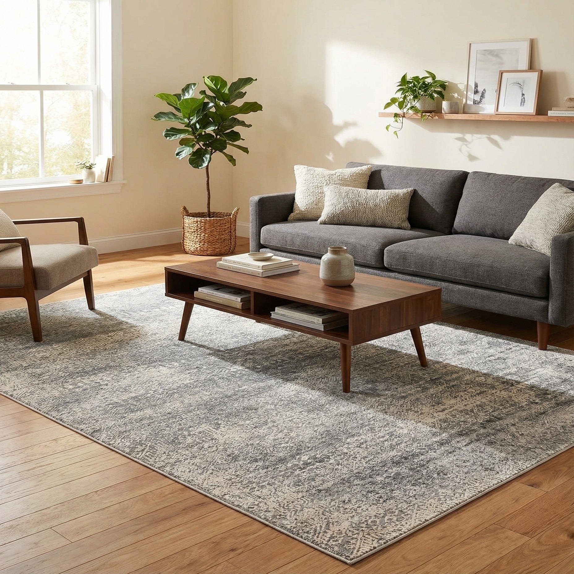 Primary color is Gray. Colors in this rug include: Gray, Ivory.